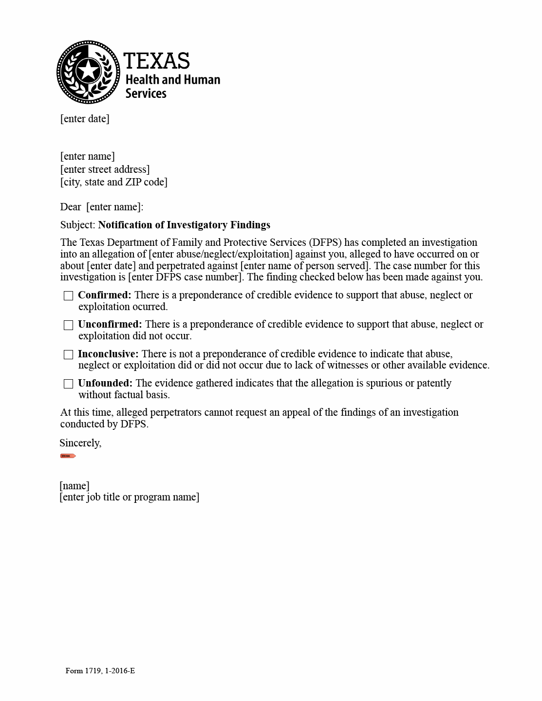 The TX HHS Form 1719, Notification of Investigatory Findings, is a crucial document used by the Texas Department of Family and Protective Services (DFPS) to notify individuals of the findings from an investigation into allegations of abuse, neglect, or exploitation. This form helps ensure that those affected by these incidents are informed of the outcome and can take necessary steps to address any concerns.