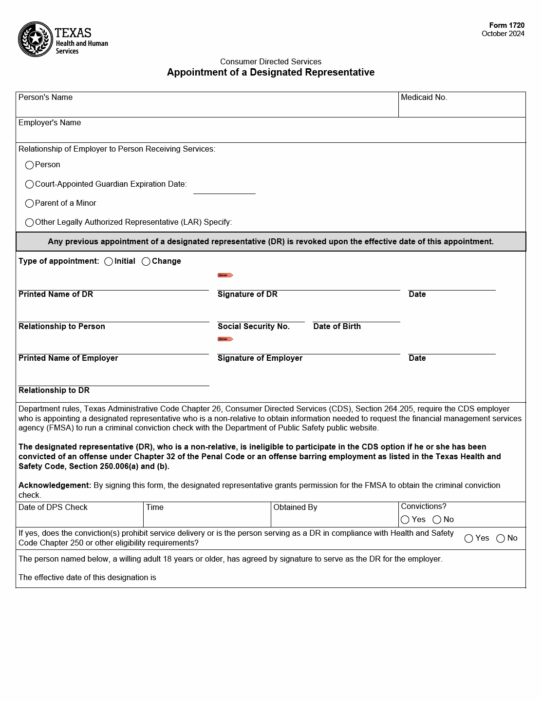 The Form 1720 is a crucial tool for employers seeking to appoint a non-relative designated representative. By using this form, employers can ensure compliance with Department of Public Services rules and regulations, as outlined in the Texas Administrative Code Chapter 26, Consumer Directed Services (CDS), Section 264.205. This form is an essential part of the consumer-directed services process and helps to facilitate efficient and effective service delivery.