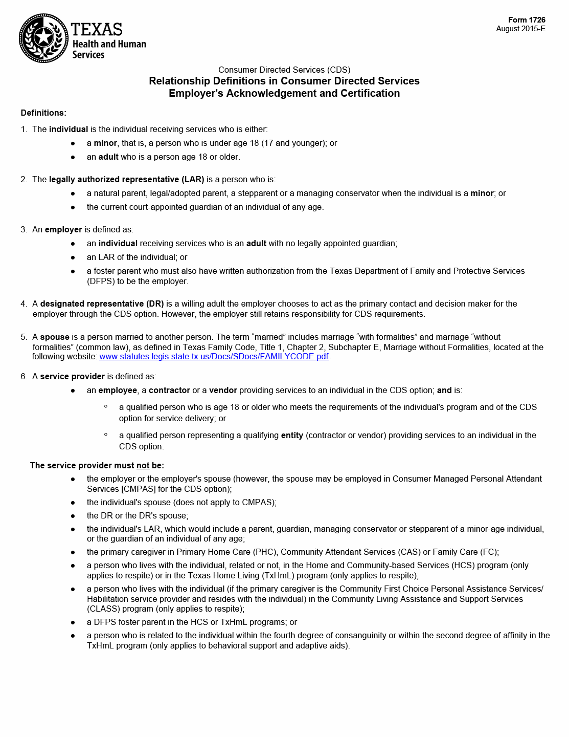 The Texas Department of Health and Human Services (HHS) has issued Form 1726 to provide definitions for consumer-directed services. This form aims to clarify the relationships involved in Consumer-Directed Services (CDS), ensuring that individuals receiving services understand their roles and responsibilities.
