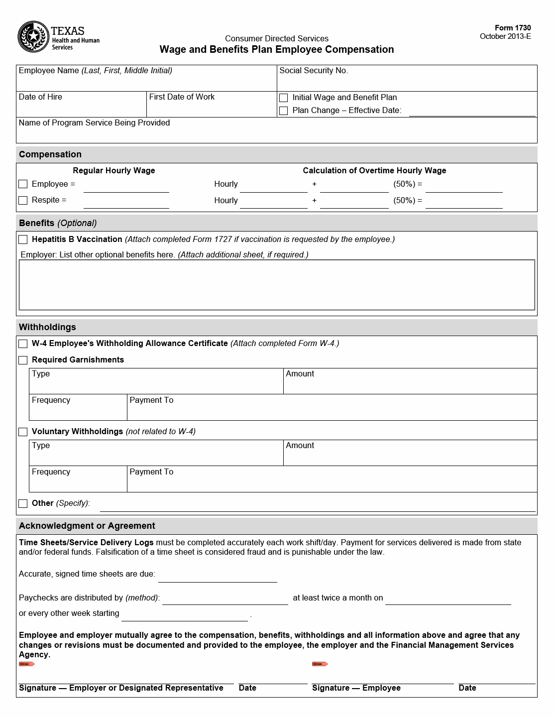The TX HHS Form 1730 is a crucial document that outlines the mutual agreement between employees and employers regarding compensation, benefits, withholdings, and other essential information. Both parties must sign and date the form to acknowledge their understanding and consent. The form also highlights the importance of accurate time sheets and payment for services delivered from state and federal funds.