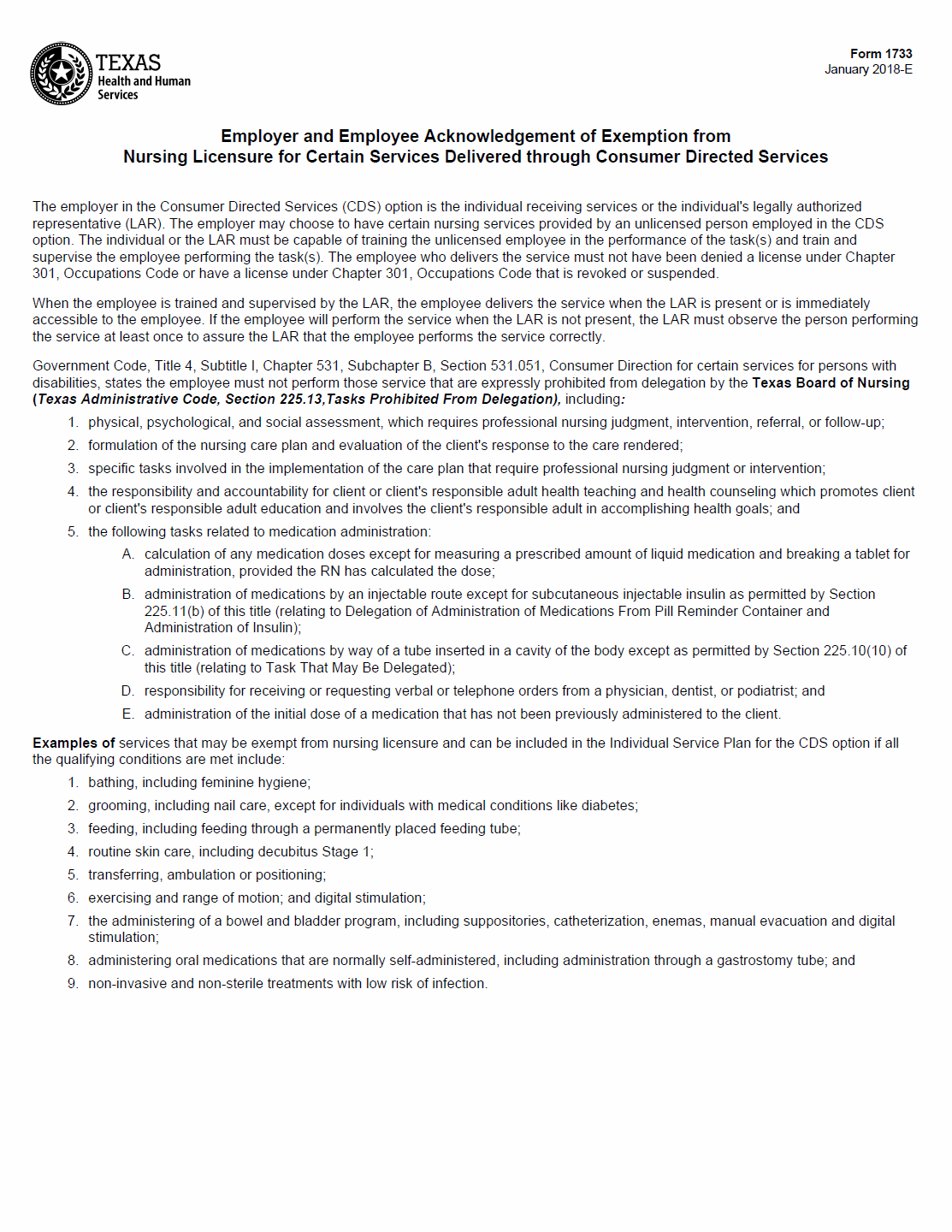 TX HHS Form 1733. Employer and Employee Acknowledgement of Exemption from Nursing Licensure for Certain Services Delivered through Consumer Directed Services