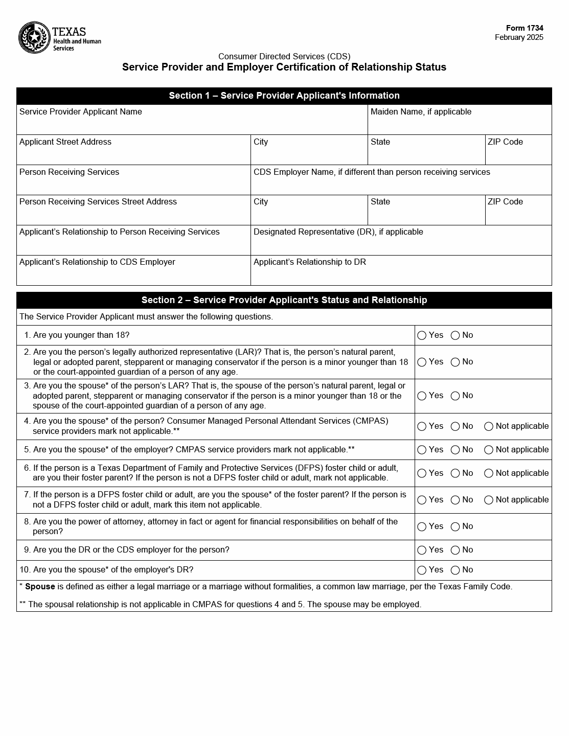 TX HHS Form 1734. Service Provider and Employer Certification of Relationship Status for CDS
