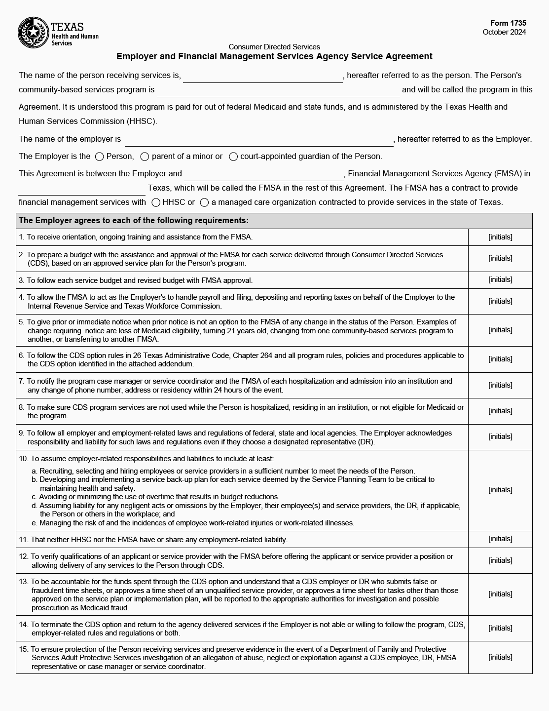 TX HHS Form 1735. Employer and Financial Management Services Agency Service Agreement