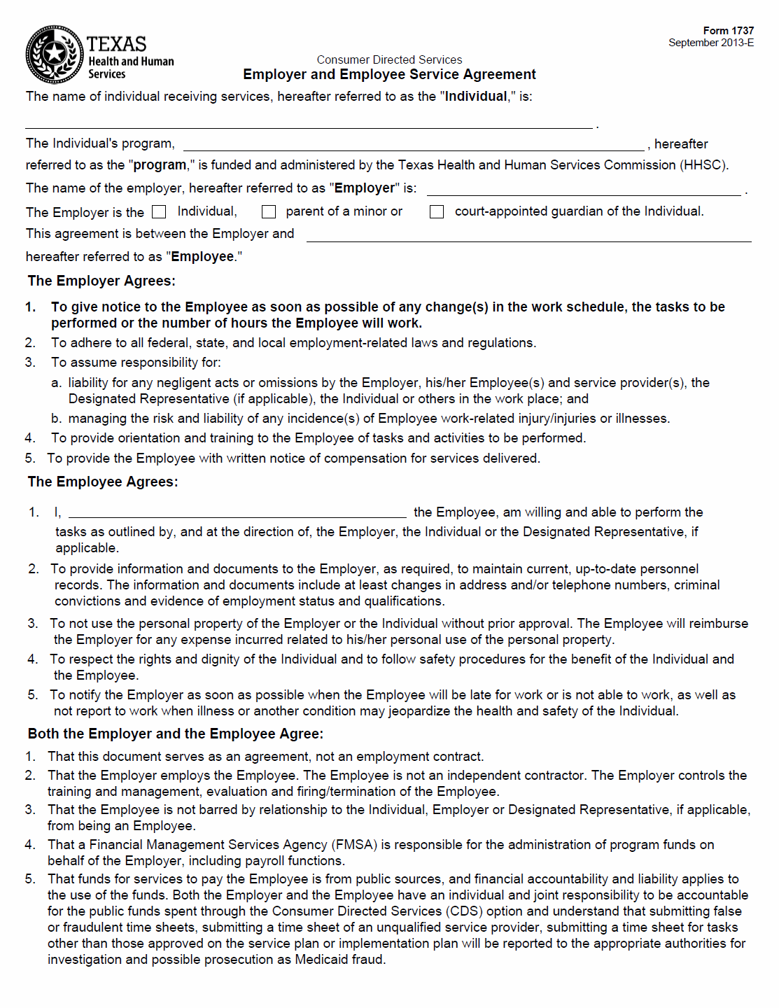 TX HHS Form 1737. Employer and Employee Service Agreement