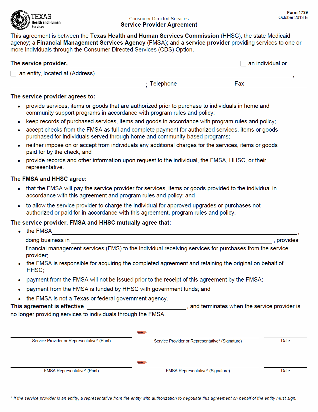 The Texas Health and Human Services (HHS) Form 1739, Service Provider Agreement, is a contractual agreement between the HHS Commission, Financial Management Services Agency (FMSA), and a service provider offering services to individuals through the Consumer Directed Services (CDS) Option. The purpose of this form is to outline the terms and conditions for providing authorized services, items, or goods to individuals in home and community support programs.