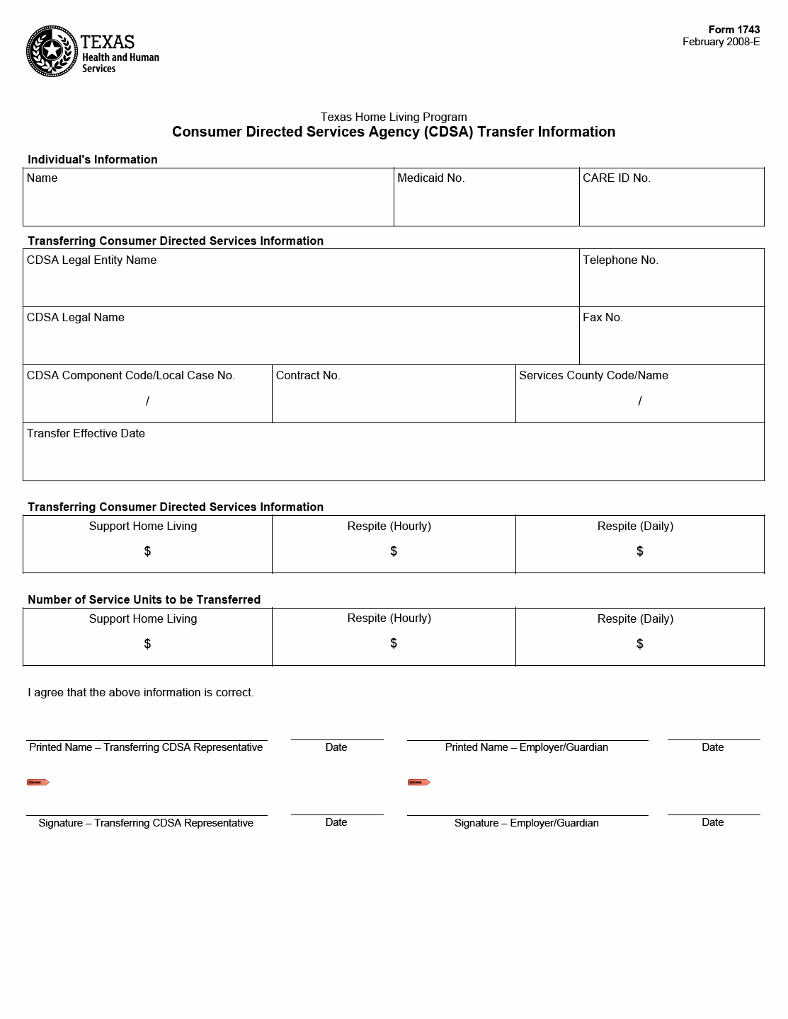 This form is designed for use by the Texas Home Living Program's Consumer Directed Services Agency (CDSA) and its representatives, as well as employers or guardians involved in the transfer process. By completing this form, individuals can ensure that their services are transferred efficiently and effectively, allowing them to continue receiving the support they need. The TX HHS Form 1743 is an essential tool for promoting continuity of care and minimizing disruptions in service delivery.