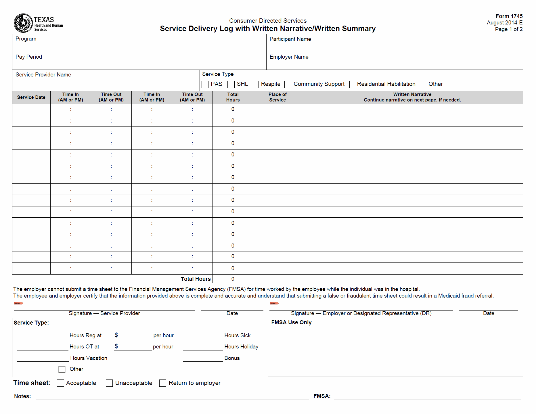 The purpose of this form is to provide a clear and accurate account of services rendered, allowing employers and service providers to maintain compliance with Medicaid regulations. The form also includes space for written narratives or summaries, enabling service providers to provide additional context about the services delivered. By using Form 1745, employers can ensure timely submission of time sheets to the Financial Management Services Agency (FMSA) and avoid potential issues related to Medicaid fraud referrals.