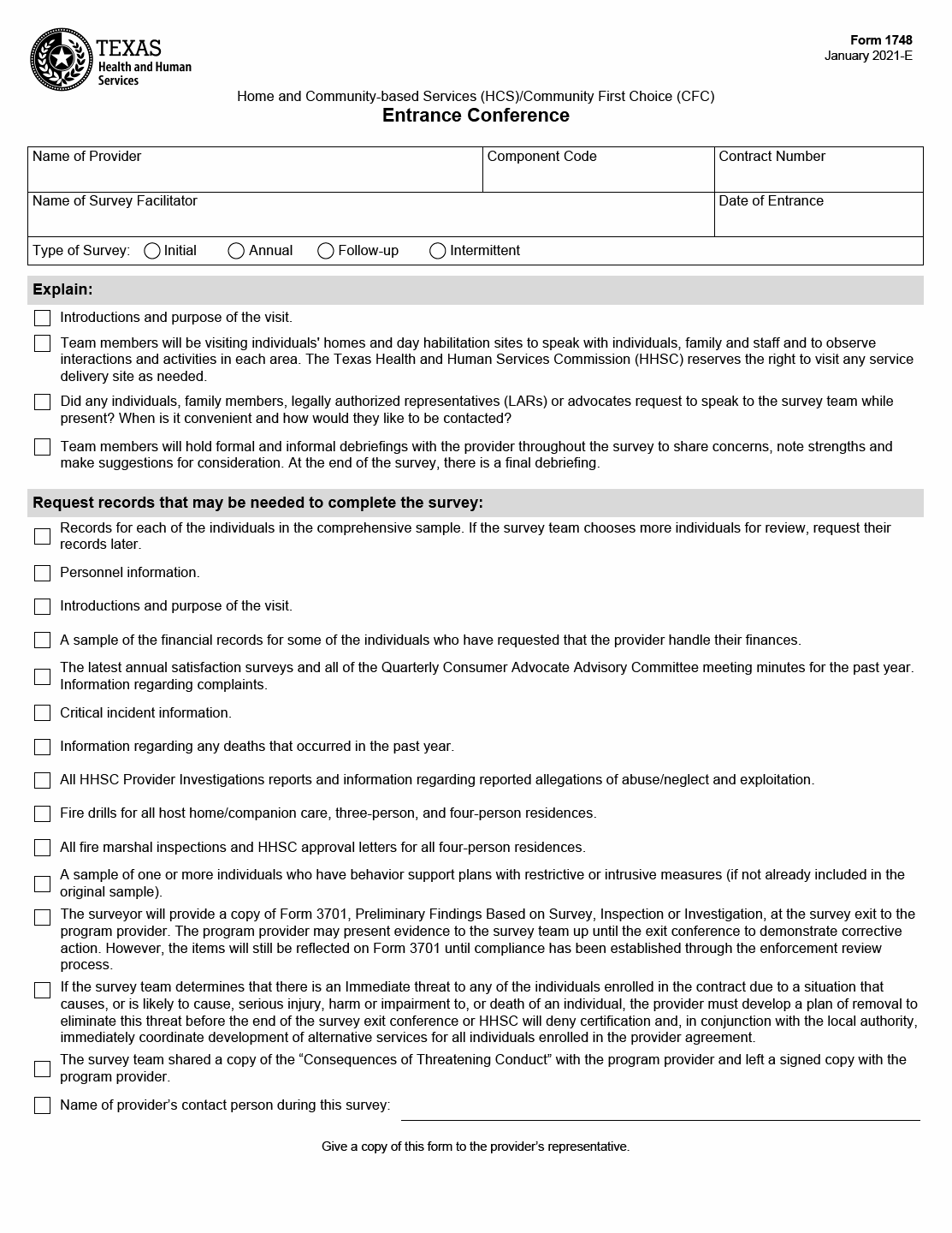 TX HHS Form 1748. HCS/CFC Entrance Conference