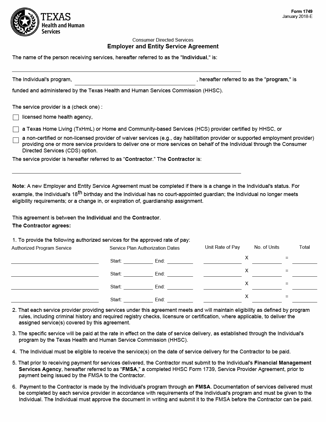 TX HHS Form 1749. Employer and Entity Service Agreement