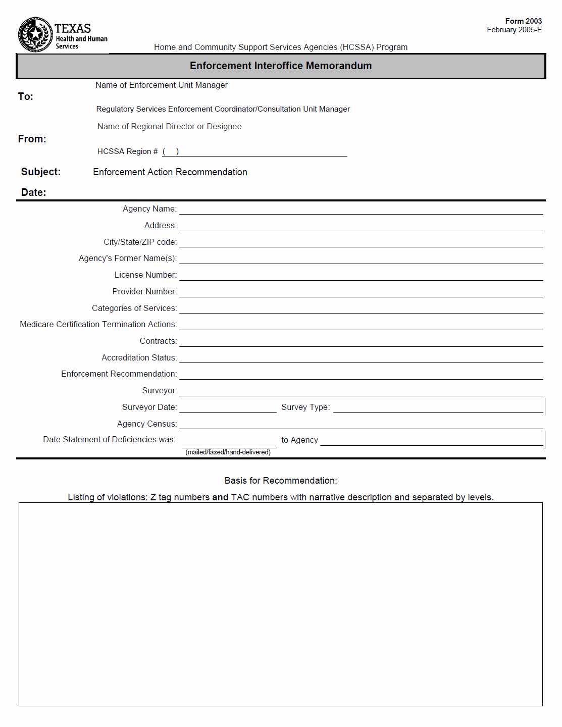 TX HHS Form 2003. Enforcement Interoffice Memorandum