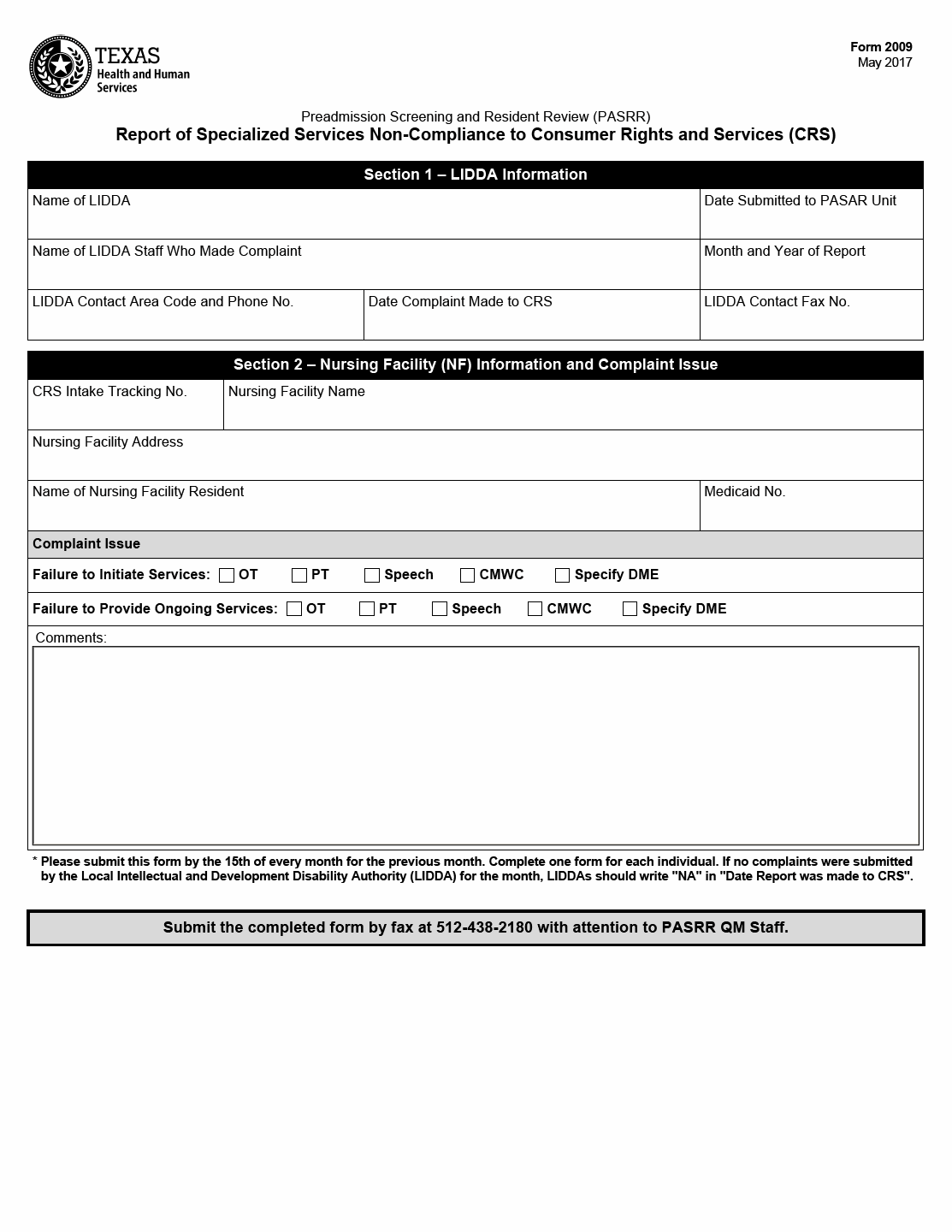 TX HHS Form 2009. Preadmission Screening and Resident Review PASRR Report of Specialized Services Non-Compliance to Consumer Rights and Services CRS