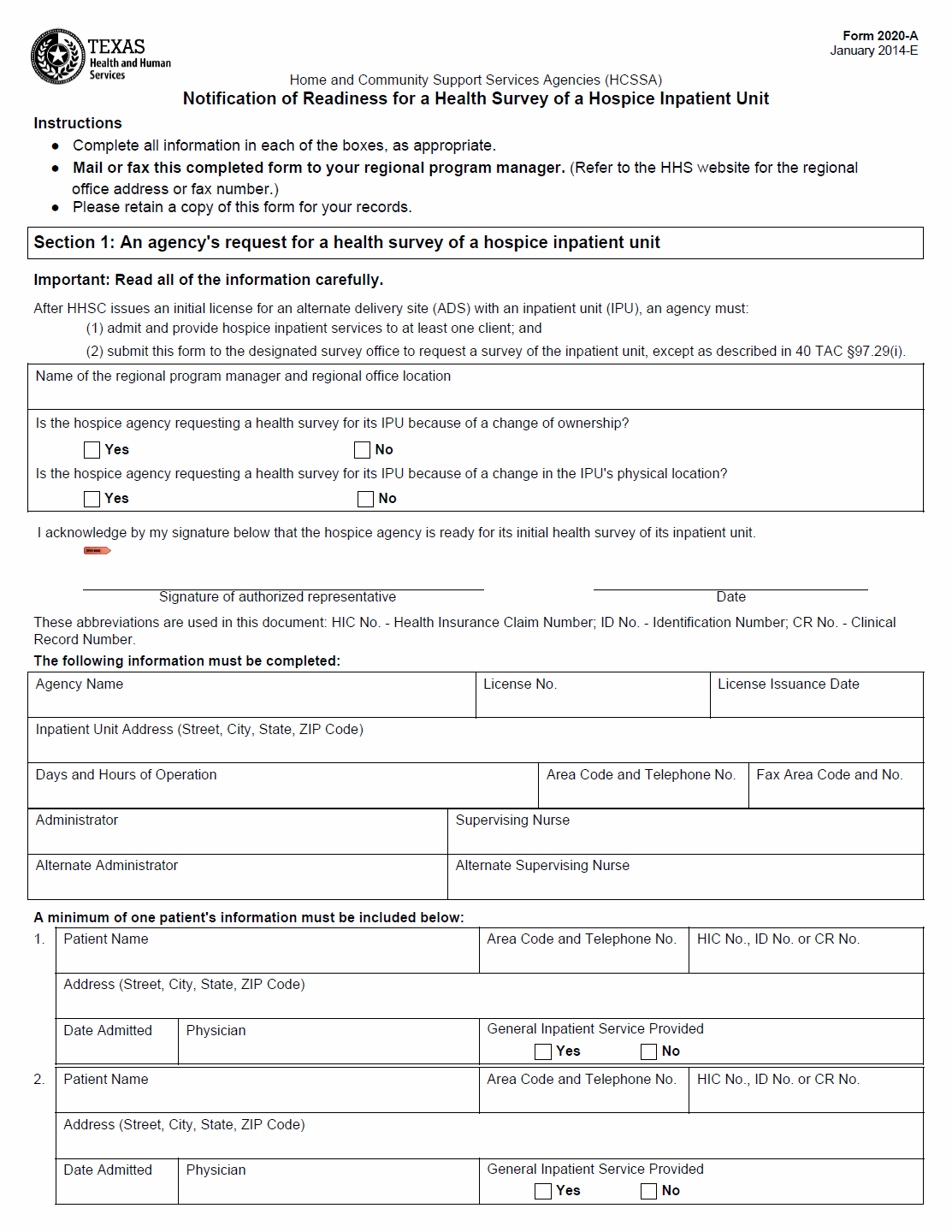 TX HHS Form 2020-A. Notification of Readiness for a Health Survey of a Hospice Inpatient Unit