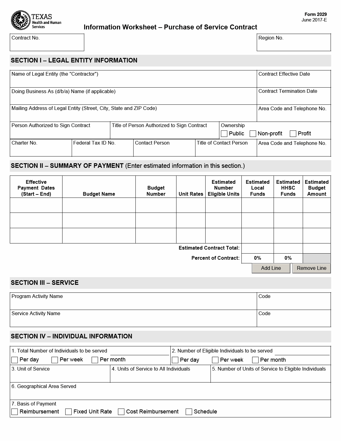 TX HHS Form 2029. Information Worksheet - POS Contract