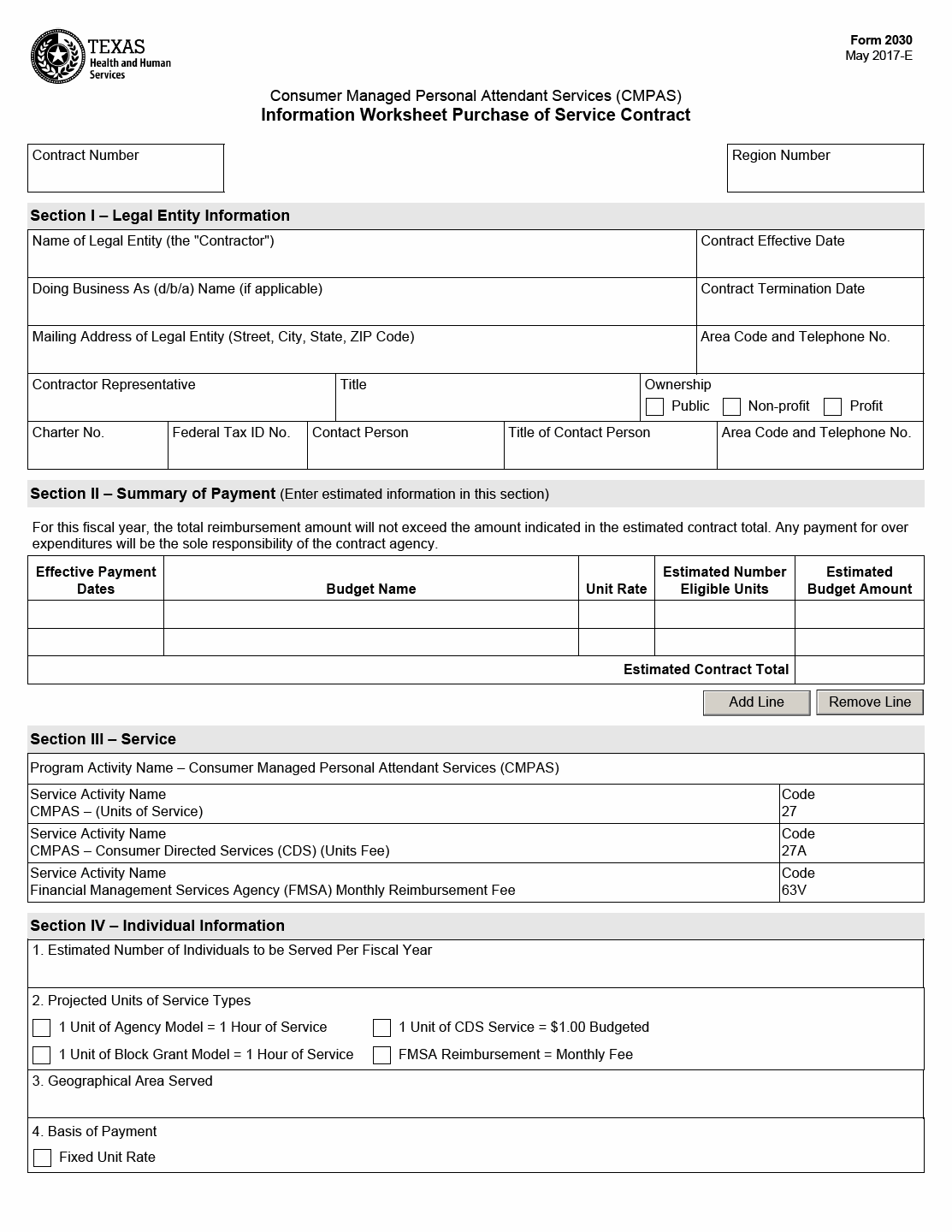 TX HHS Form 2030. Information Worksheet Purchase of Service Contract (CMPAS)