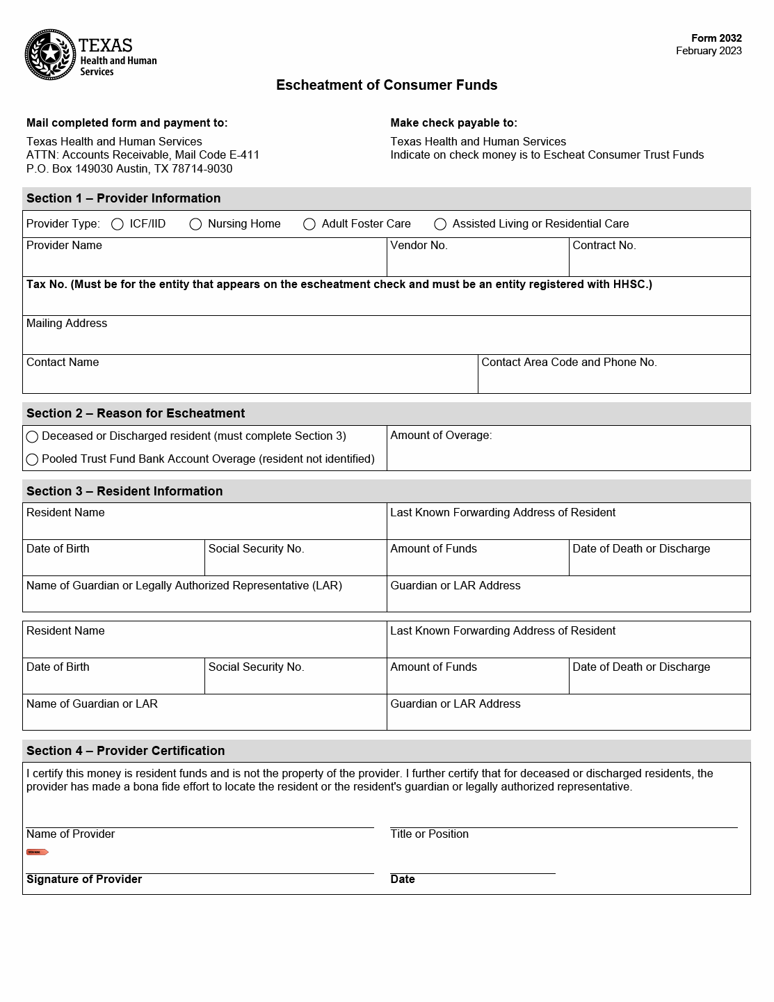 TX HHS Form 2032. Escheatment of Consumer Funds