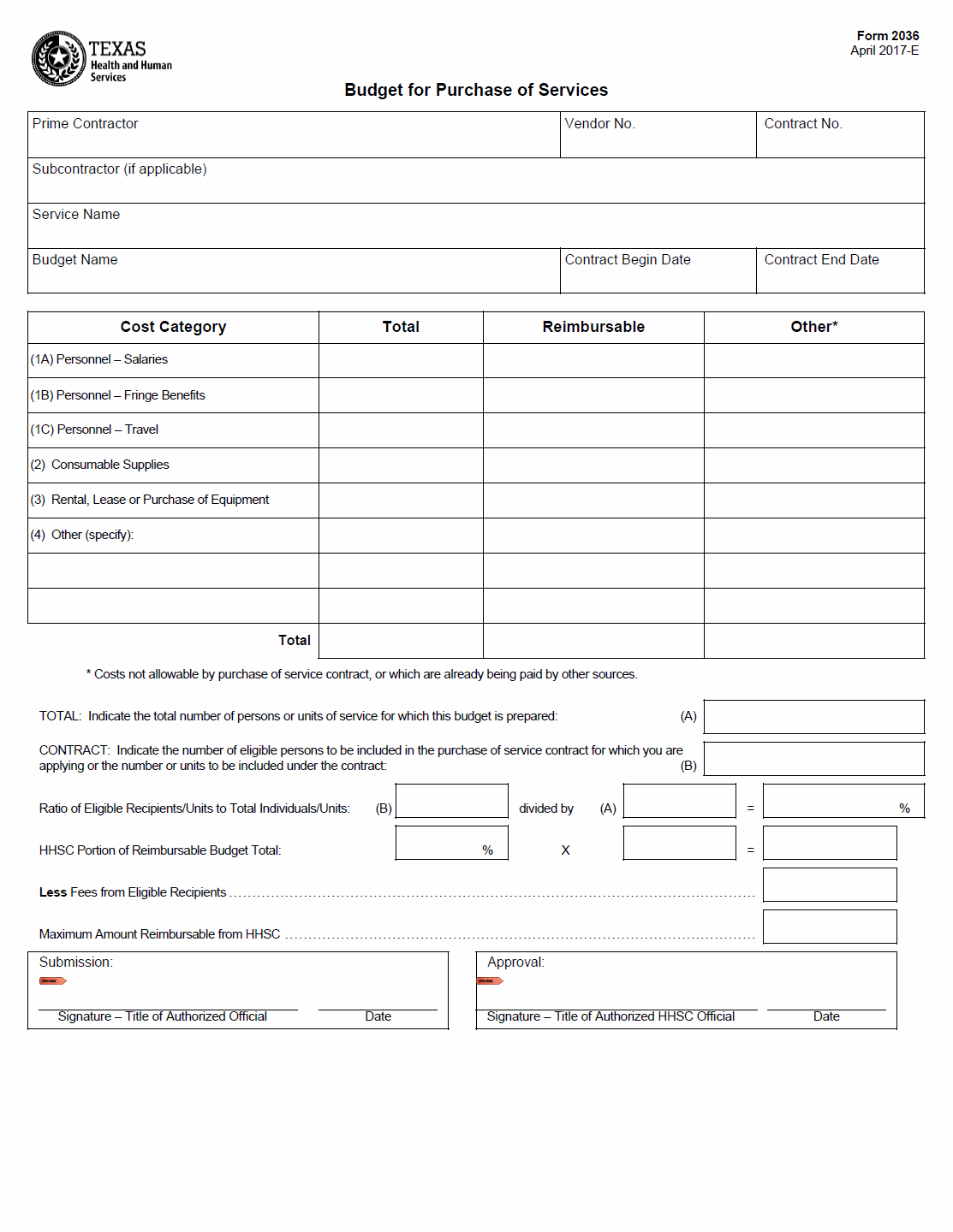 The TX HHS Form 2036, "Budget for Purchase of Services," is a crucial document used by Prime Contractors to outline their budget for purchasing services from Subcontractors. Issued by the Texas Health and Human Services (HHS), this form serves as a vital tool for tracking costs and ensuring compliance with contract requirements.