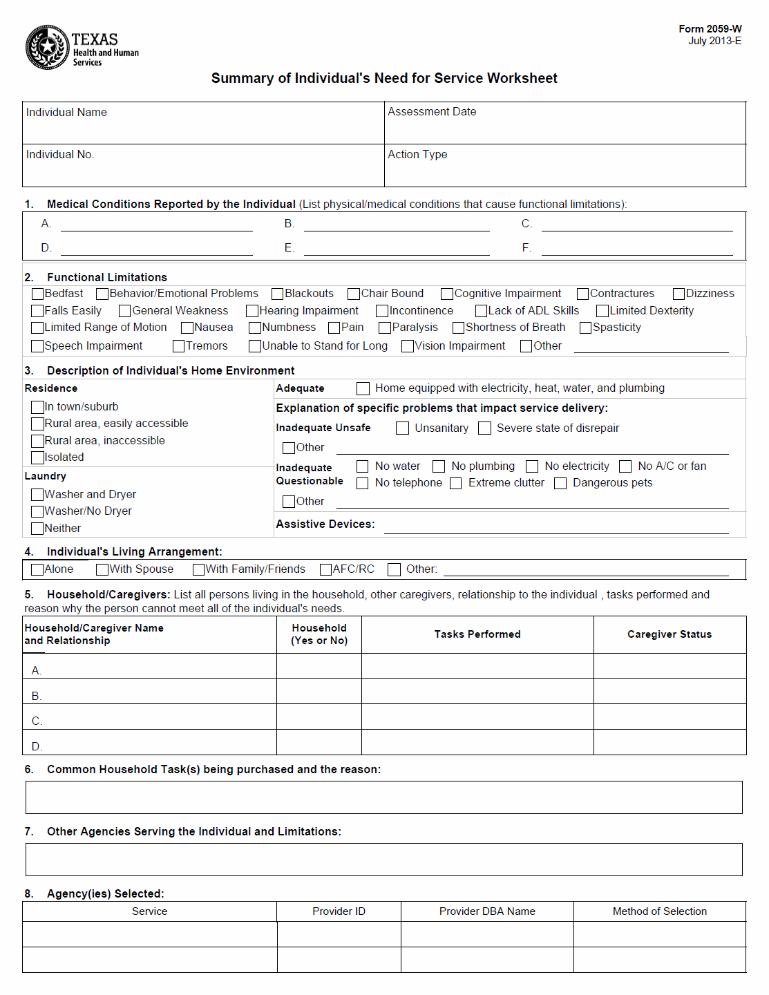 TX HHS Form 2059-W. Summary of Individual's Need for Service Worksheet