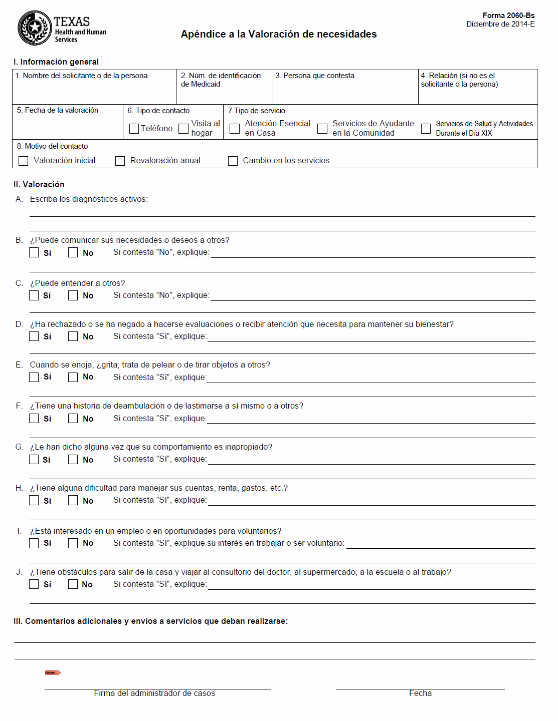 TX HHS Form 2060-B. Needs Assessment Addendum