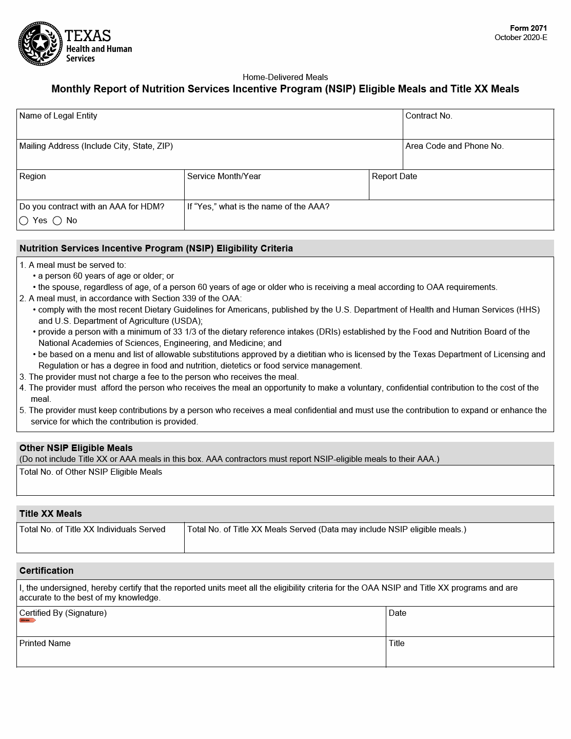 TX HHS Form 2071. Monthly Report of Nutrition Services Incentive Program (NSIP) Eligible Meals and Title XX Meals