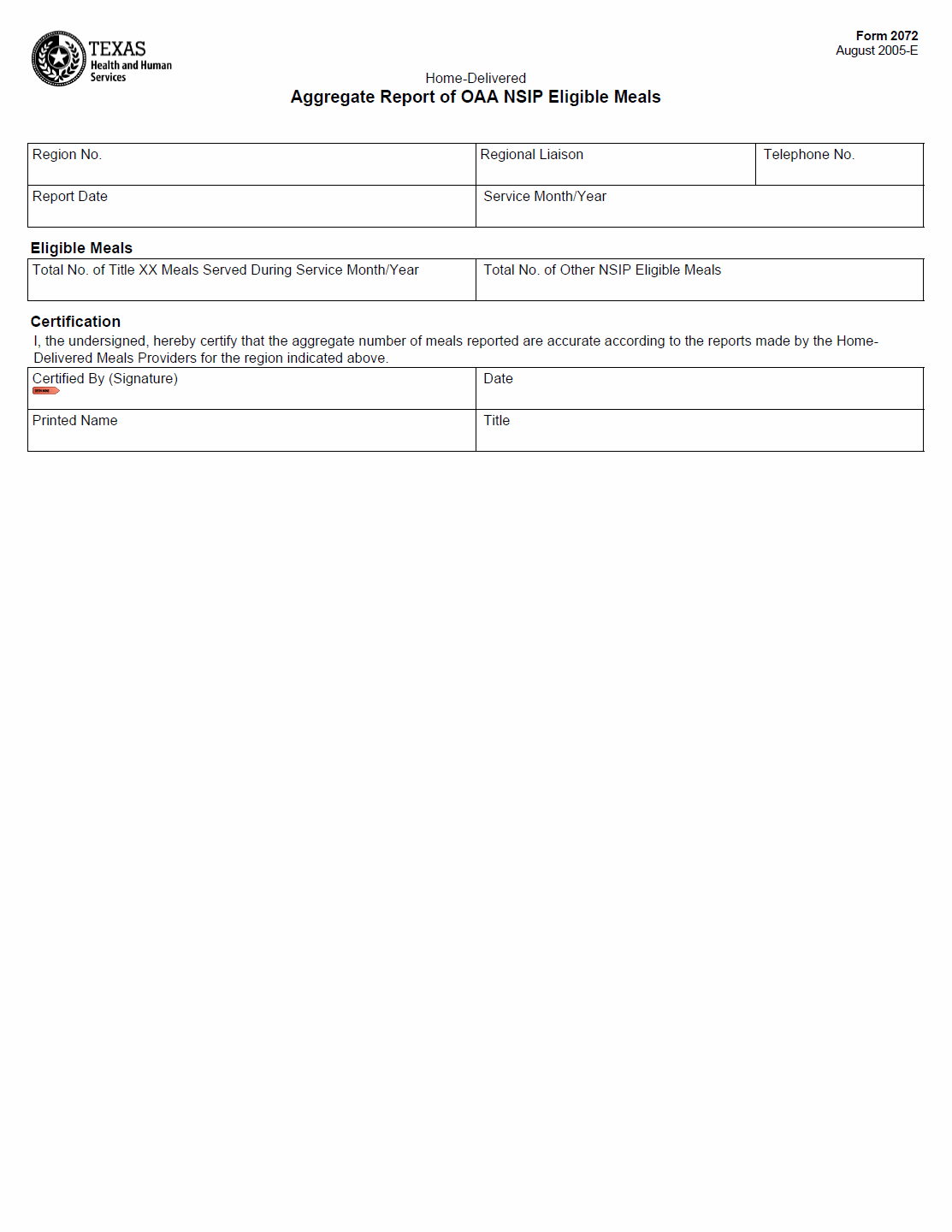TX HHS Form 2072. Aggregate Report of OAA NSIP Eligible Meals