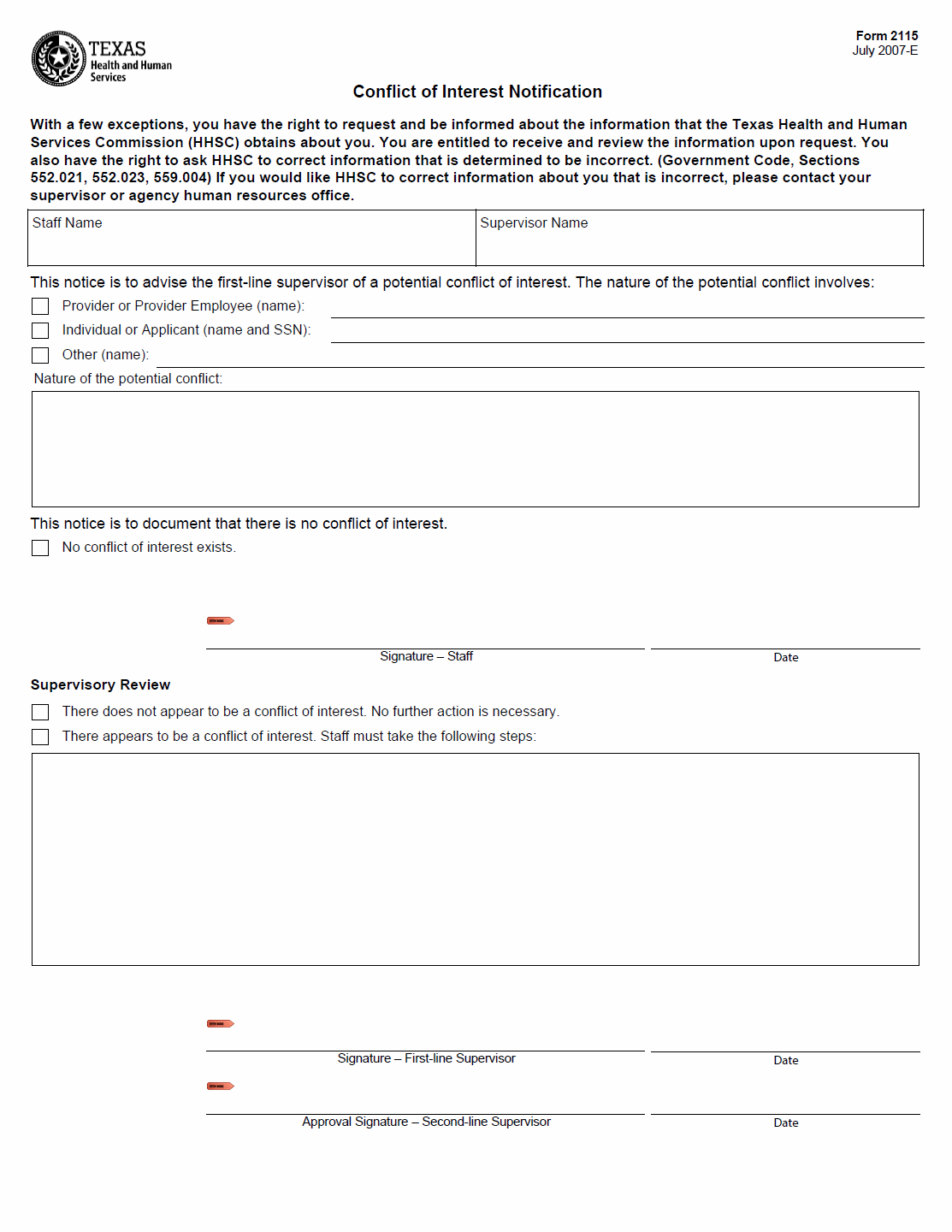 The Texas Health and Human Services (HHS) issues Form 2115, Conflict of Interest Notification, to notify first-line supervisors of potential conflicts of interest. This form serves as a tool for employees or providers to document the absence of any conflict of interest.