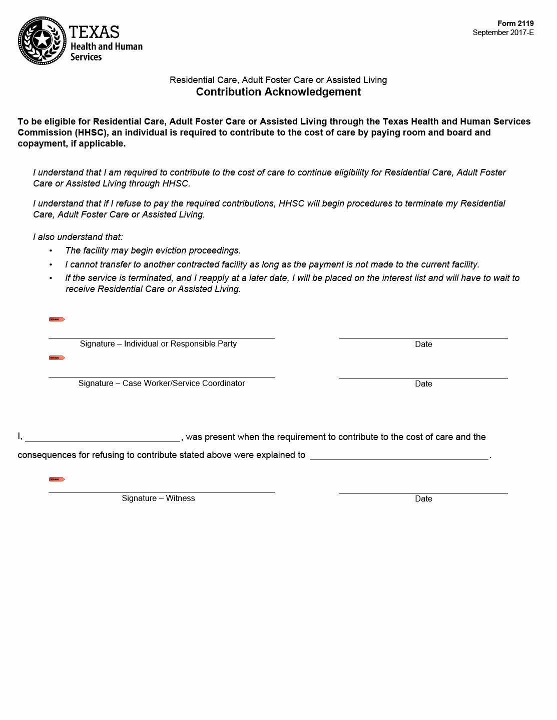 TX HHS Form 2119. Residential Care. Adult Foster Care or Assisted Living Contribution Acknowledgement