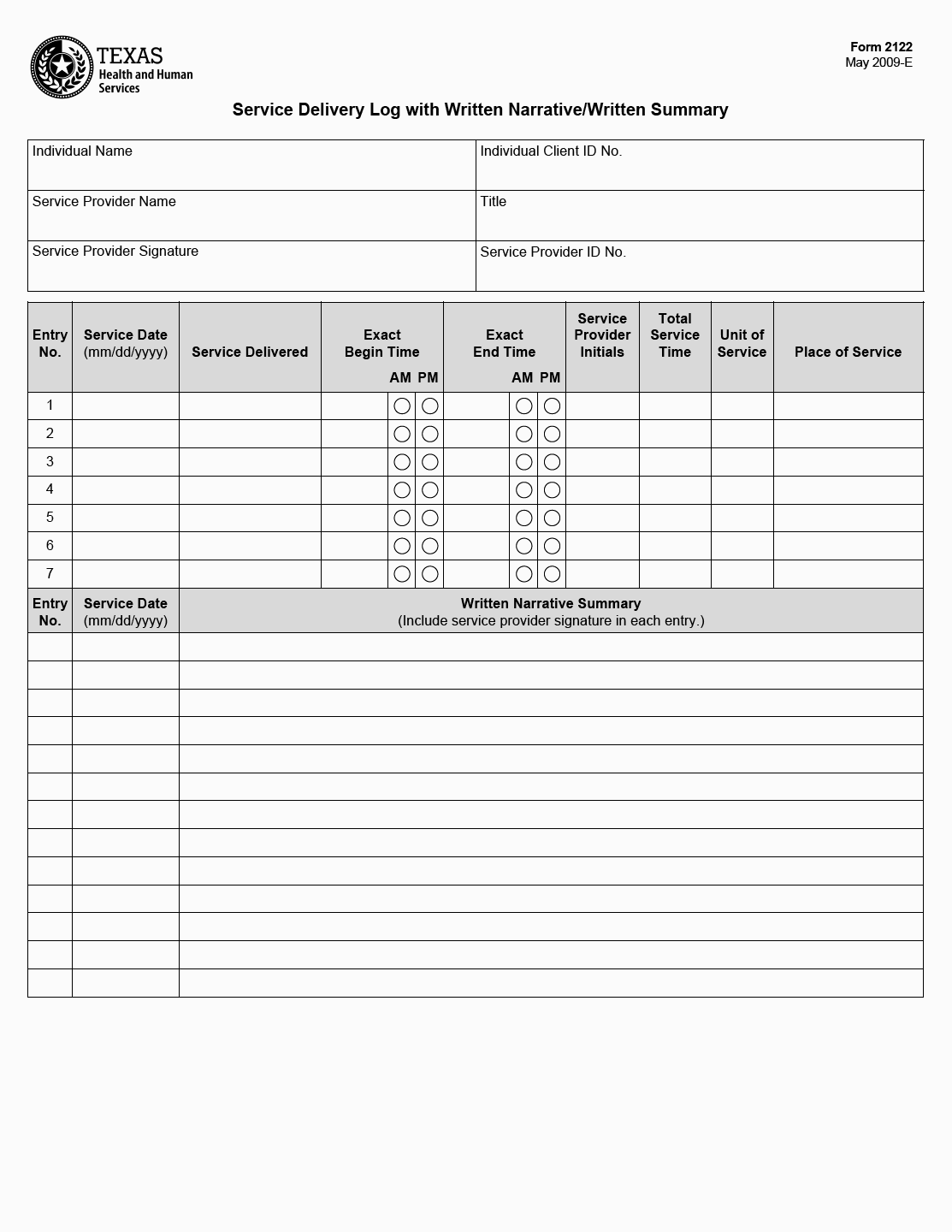 TX HHS Form 2122. Service Delivery Log with Written Narrative/Written Summary