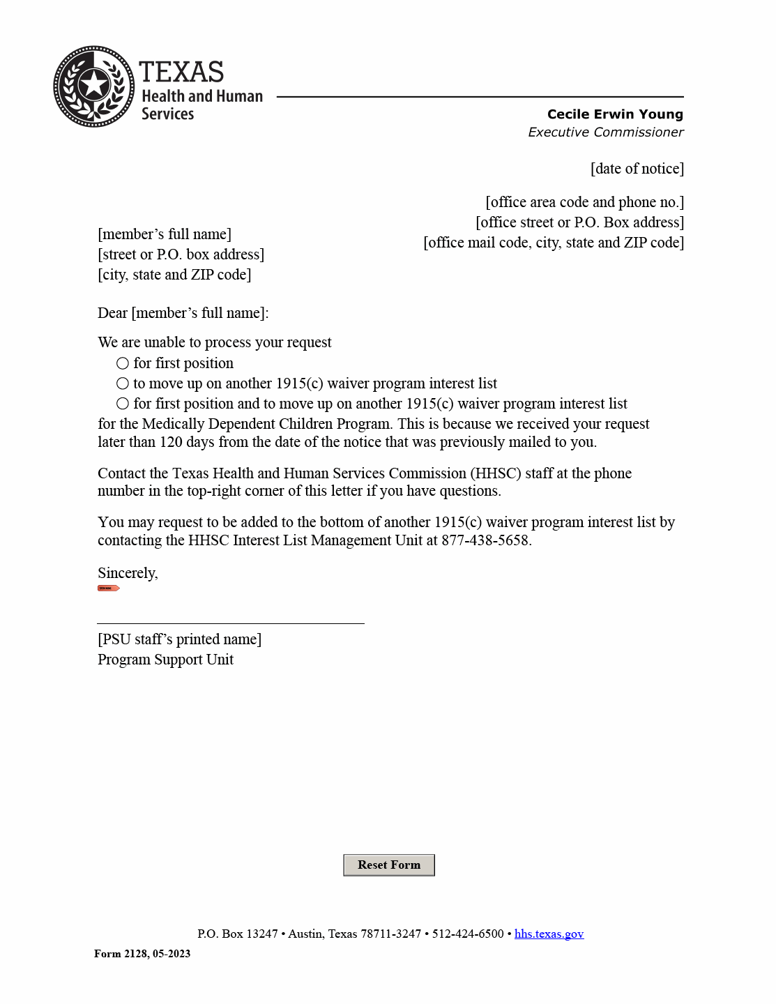 TX HHS Form 2128. 120 Day Notice