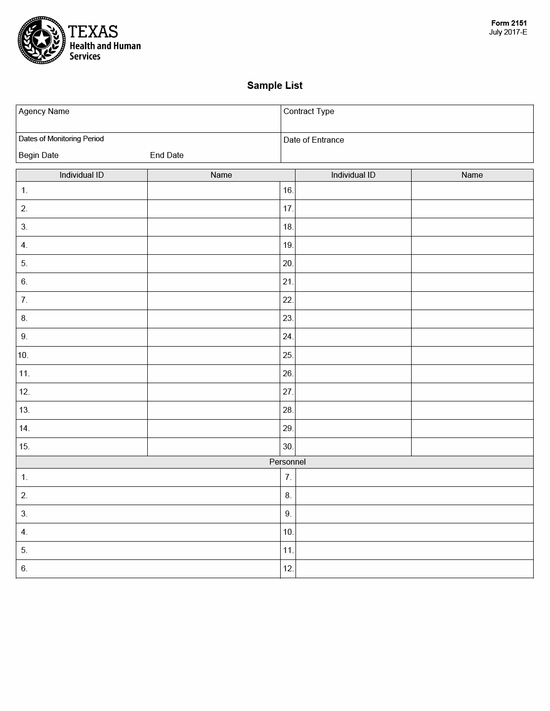 The TX HHS Form 2151, Sample List, is a tool used to monitor and track specific information over a designated period. This form helps users keep a record of dates, events, or milestones that require monitoring, making it an essential resource for tracking progress or identifying trends.