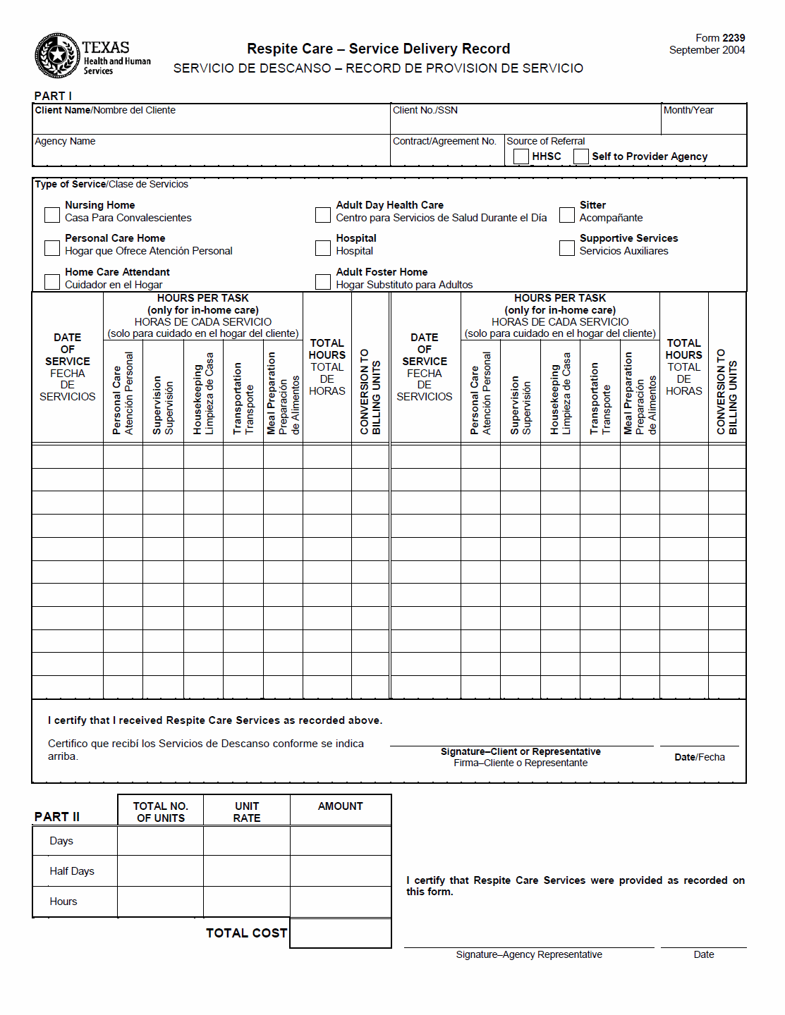 TX HHS Form 2239. Respite Care-Service Delivery Record