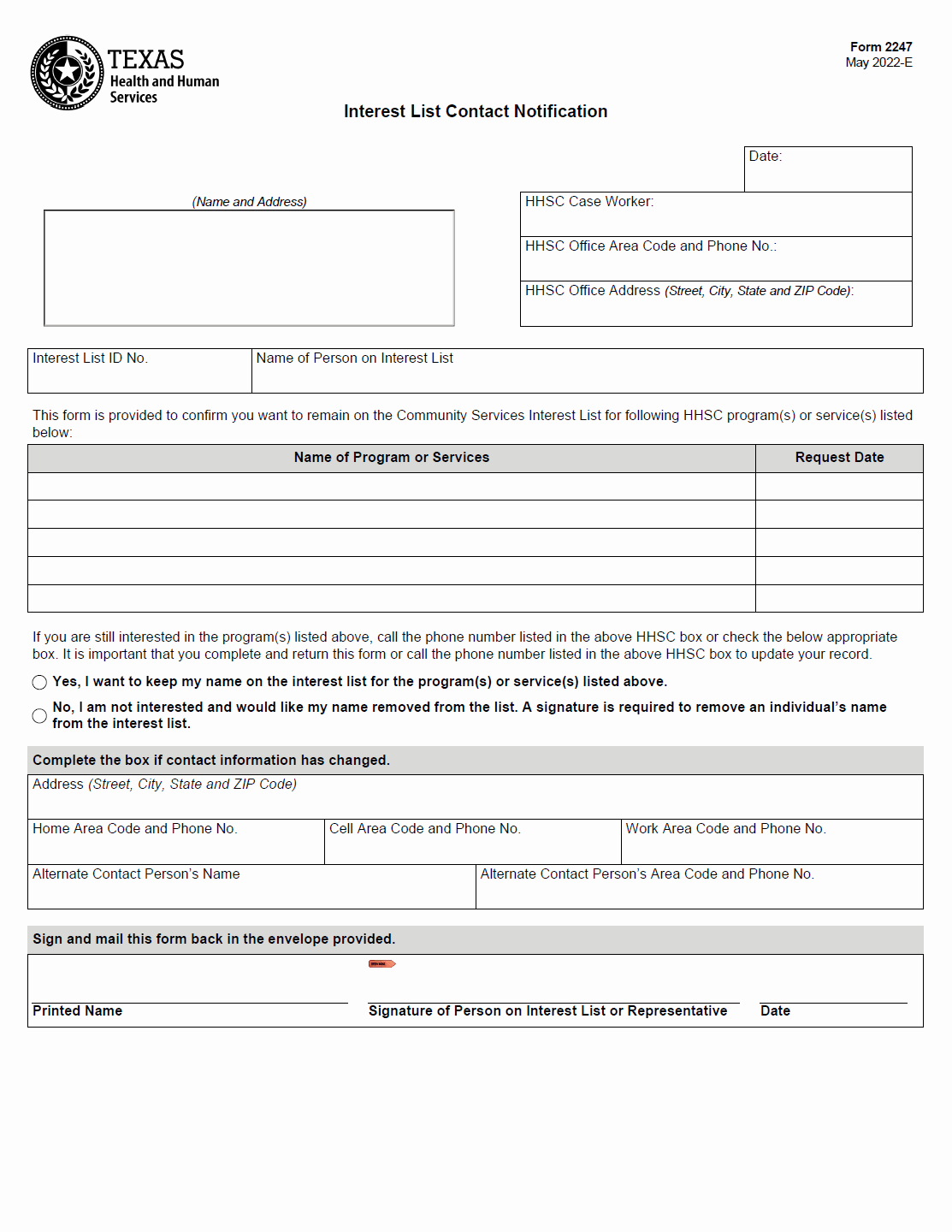 The TX HHS Form 2247 is a straightforward tool for updating records and ensuring that interested parties remain informed about available programs and services. By completing and submitting this form, individuals can ensure their continued consideration for participation in the listed HHSC program(s) or service(s), as specified on the form (TX HHS Form 2247: Interest List Contact Notification).