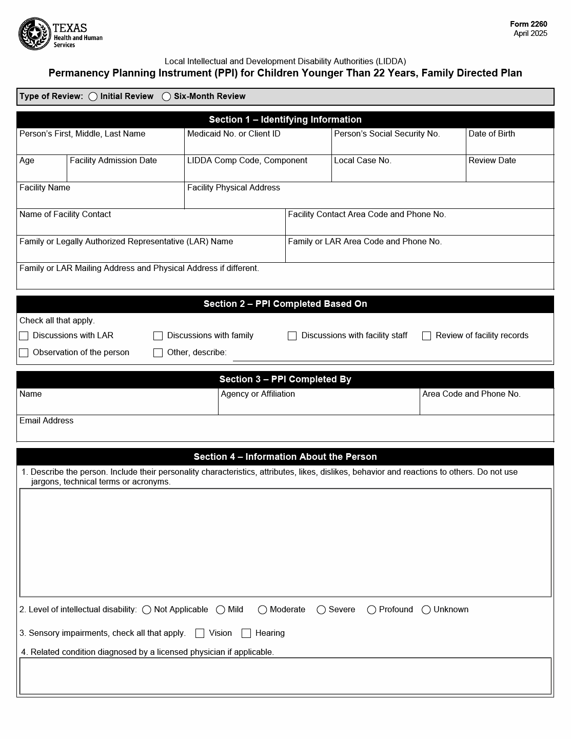 TX HHS Form 2260. LIDDA Permanency Planning Instrument (PPI) for Children Younger Than 22 Years. Family Directed Plan