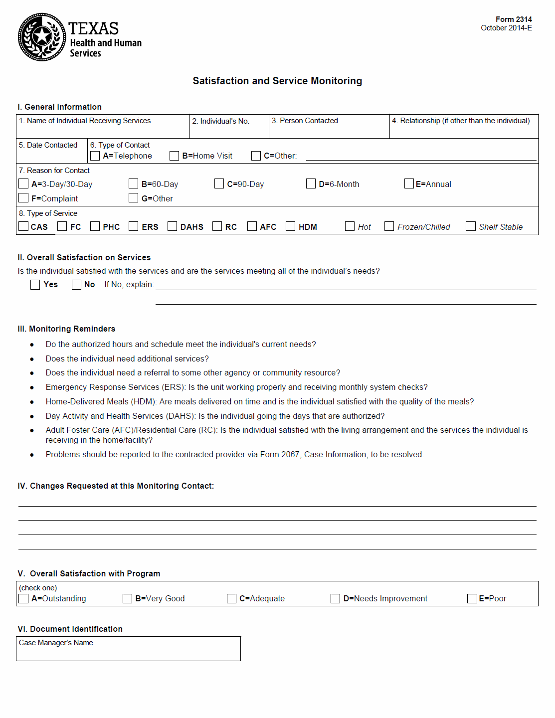 TX HHS Form 2314. Satisfaction and Service Monitoring