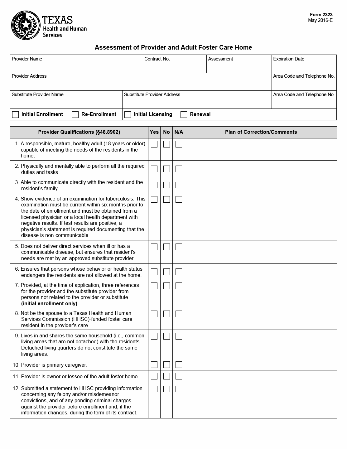 TX HHS Form 2323. Assessment of Provider and Adult Foster Care Home