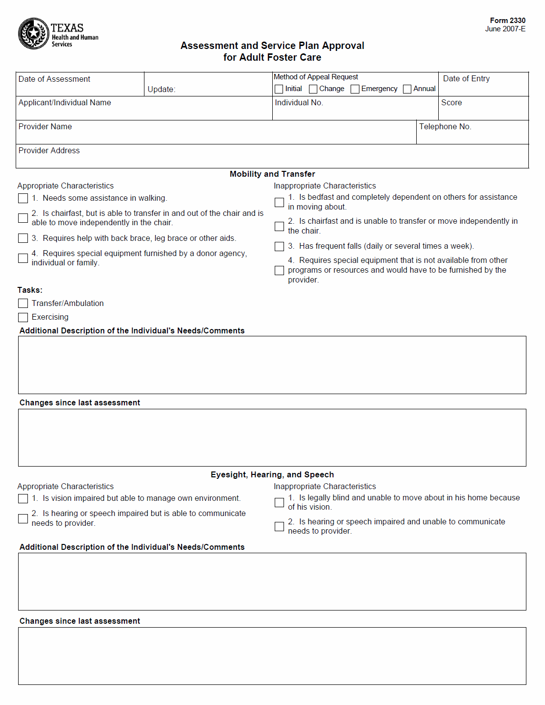 TX HHS Form 2330. Assessment and Service Plan Approval for Adult Foster Care
