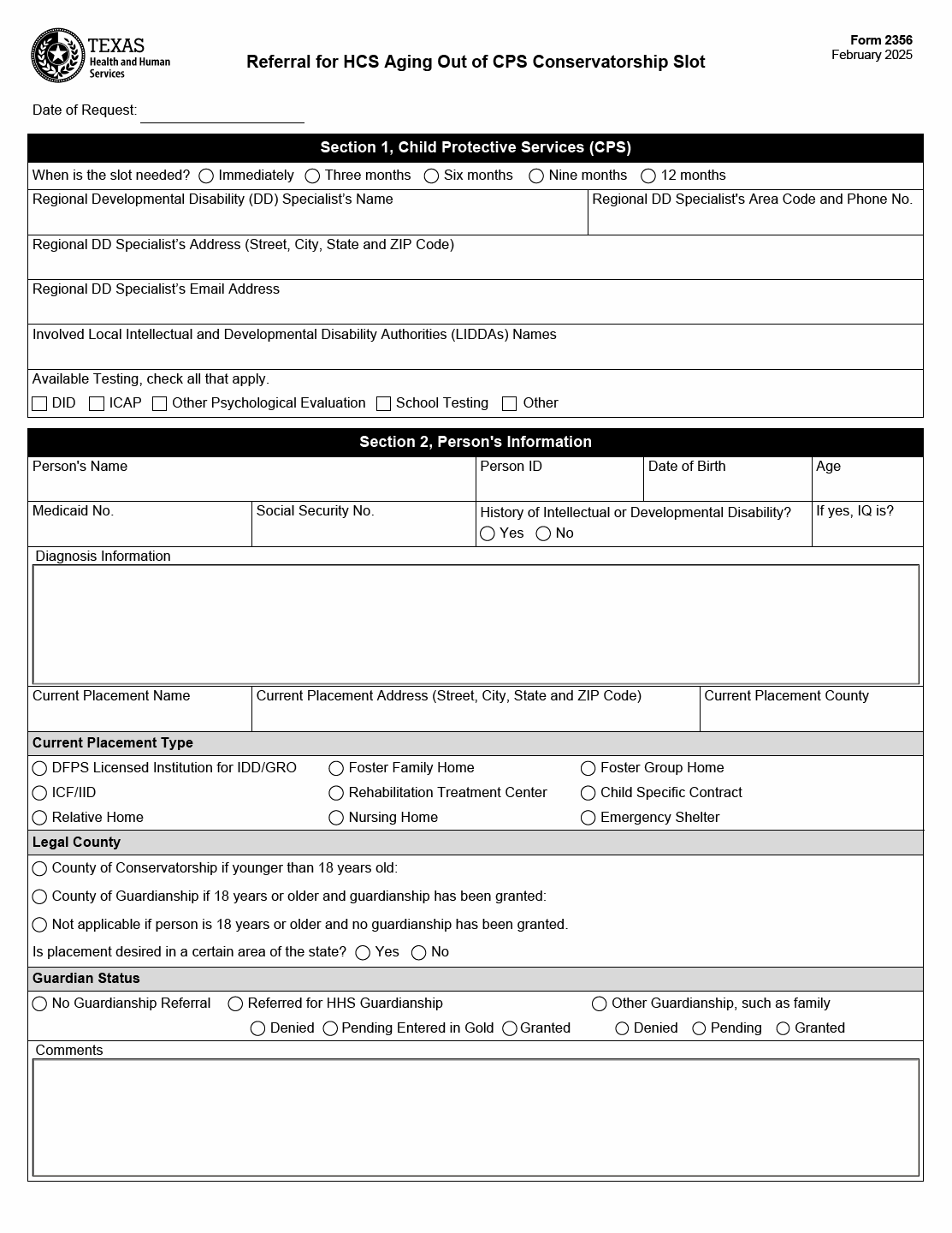 TX HHS Form 2356. Referral for HCS Aging Out of CPS Conservatorship Slot