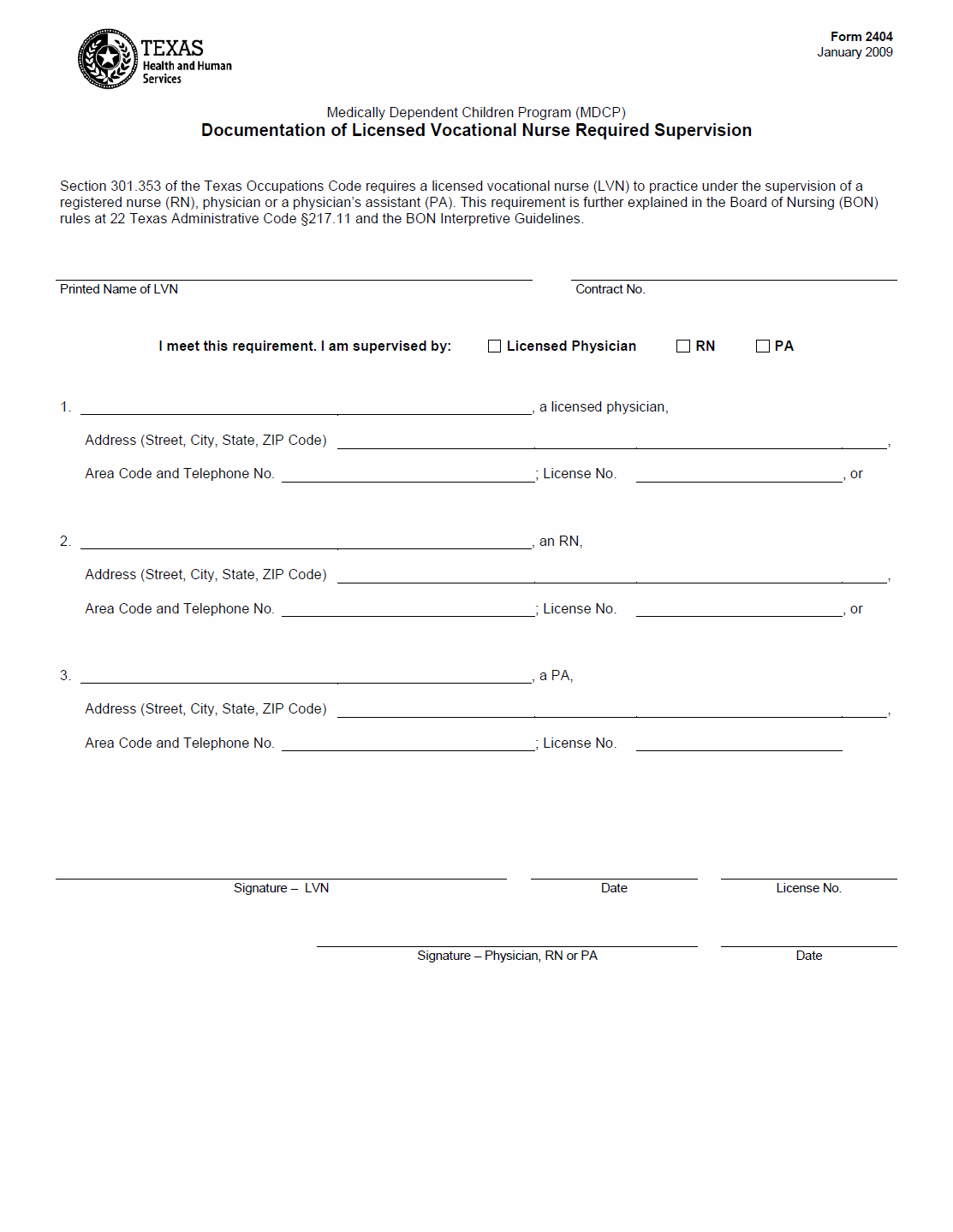 TX HHS Form 2404. Documentation of Licensed Vocational Nurse Required Supervision