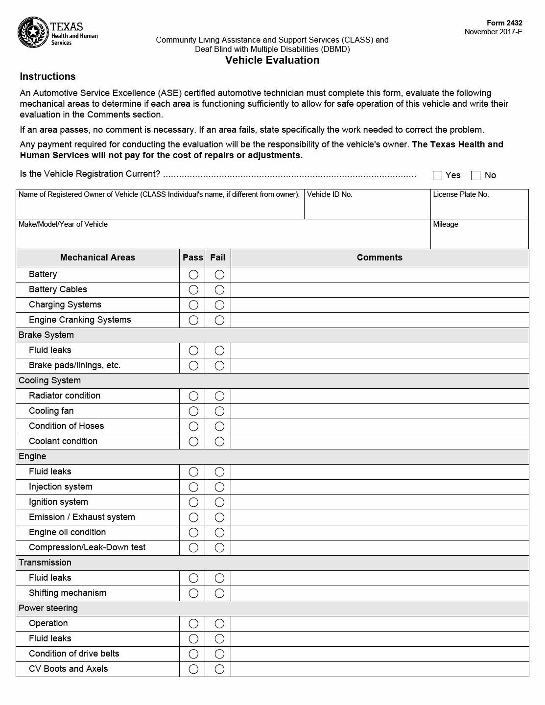 TX HHS Form 2432. CLASS and DBMD Children Program Vehicle Evaluation
