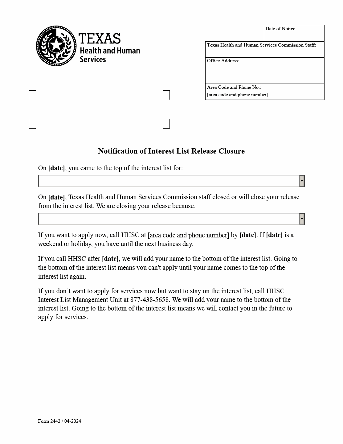 TX HHS Form 2442. Notification of Interest List Release Closure