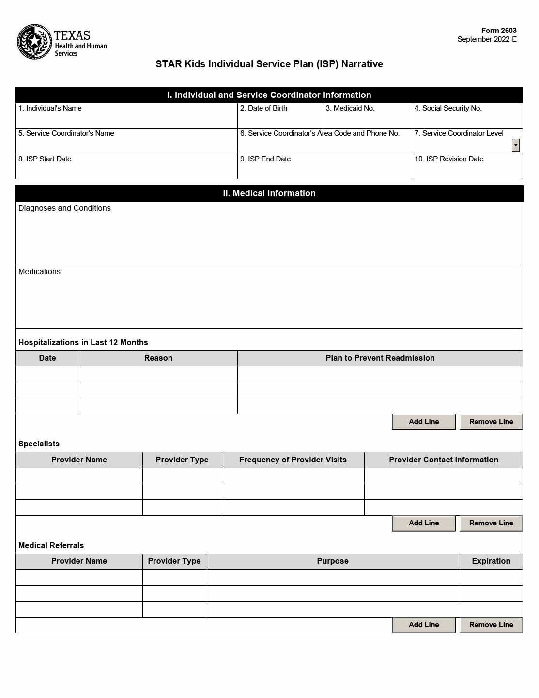 TX HHS Form 2603. STAR Kids Individual Service Plan (ISP) Narrative