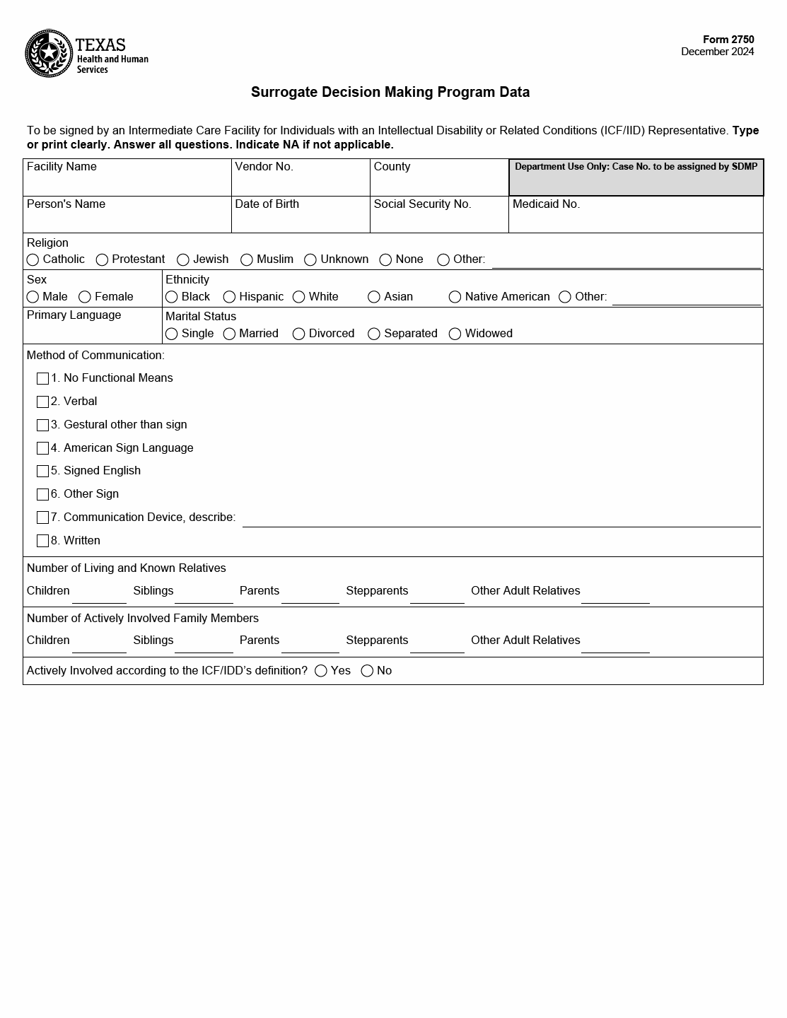TX HHS Form 2750. Surrogate Decision Making Program Data Form