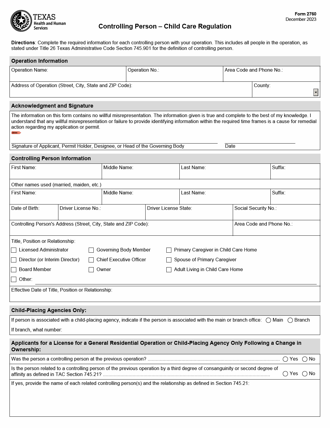 TX HHS Form 2760. Controlling Person – Child Care Regulation