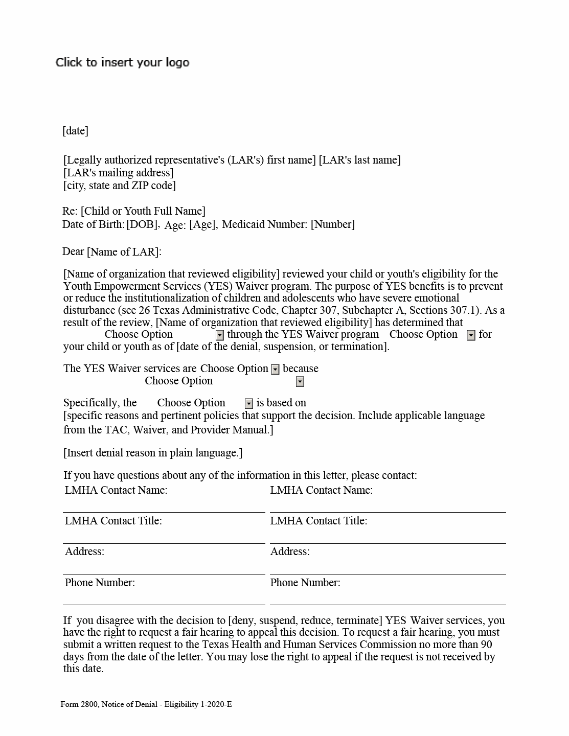 TX HHS Form 2800. Notice of Denial - Eligibility
