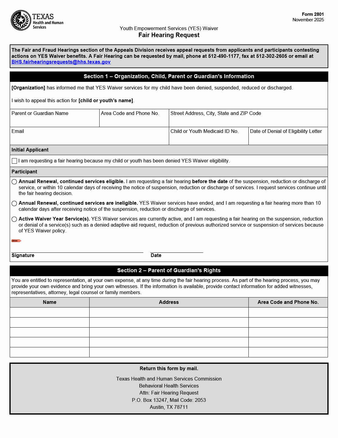 TX HHS Form 2801. Youth Empowerment Services Waiver Fair Hearing Request