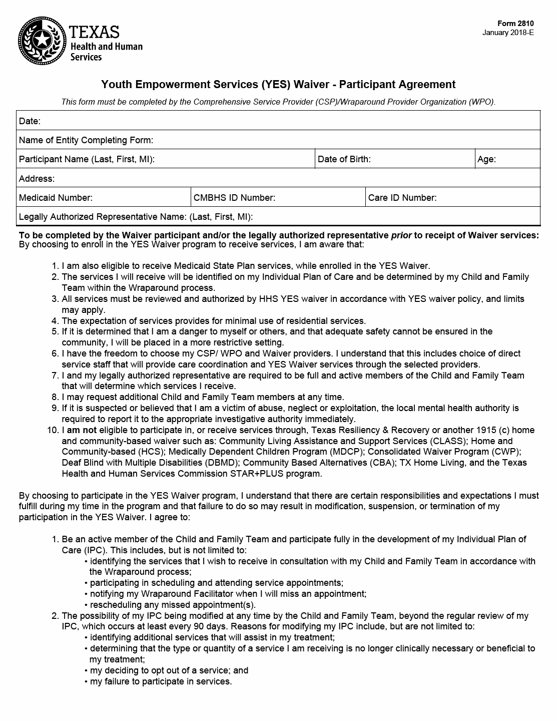 TX HHS Form 2810. Youth Empowerment Services (YES) Waiver - Participant Agreement