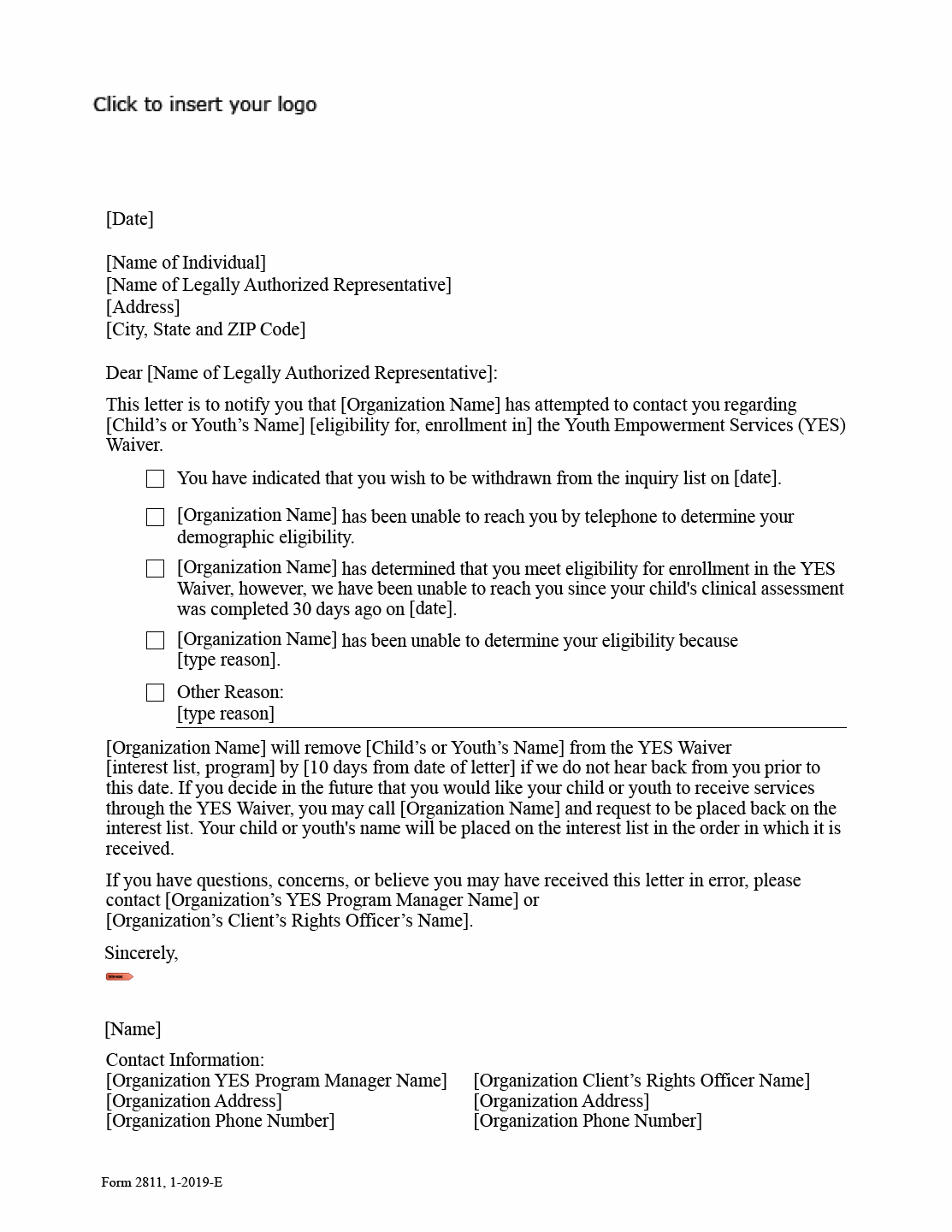 The key feature of this form is its notification of withdrawal from the inquiry list. If the legally authorized representative does not respond within 10 days, their child or youth's name will be removed from the YES Waiver interest list. The form also provides contact information for questions, concerns, or to request re-enrollment in the future.