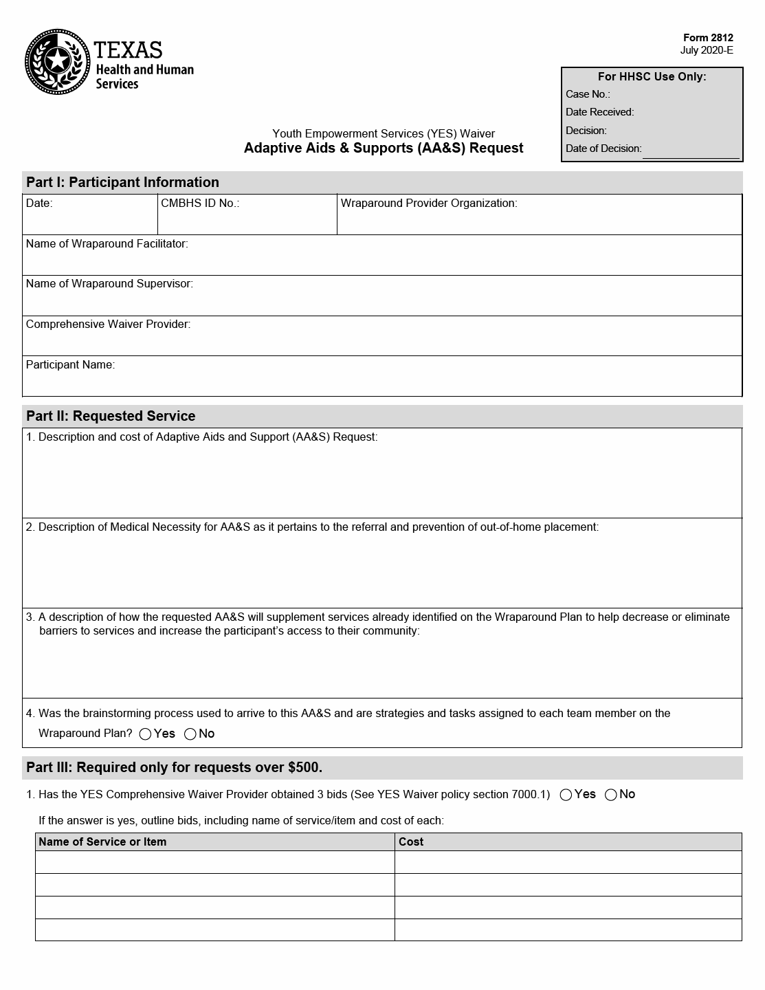TX HHS Form 2812. Youth Empowerment Services (YES) Waiver Adaptive Aids & Supports (AA&S) Request