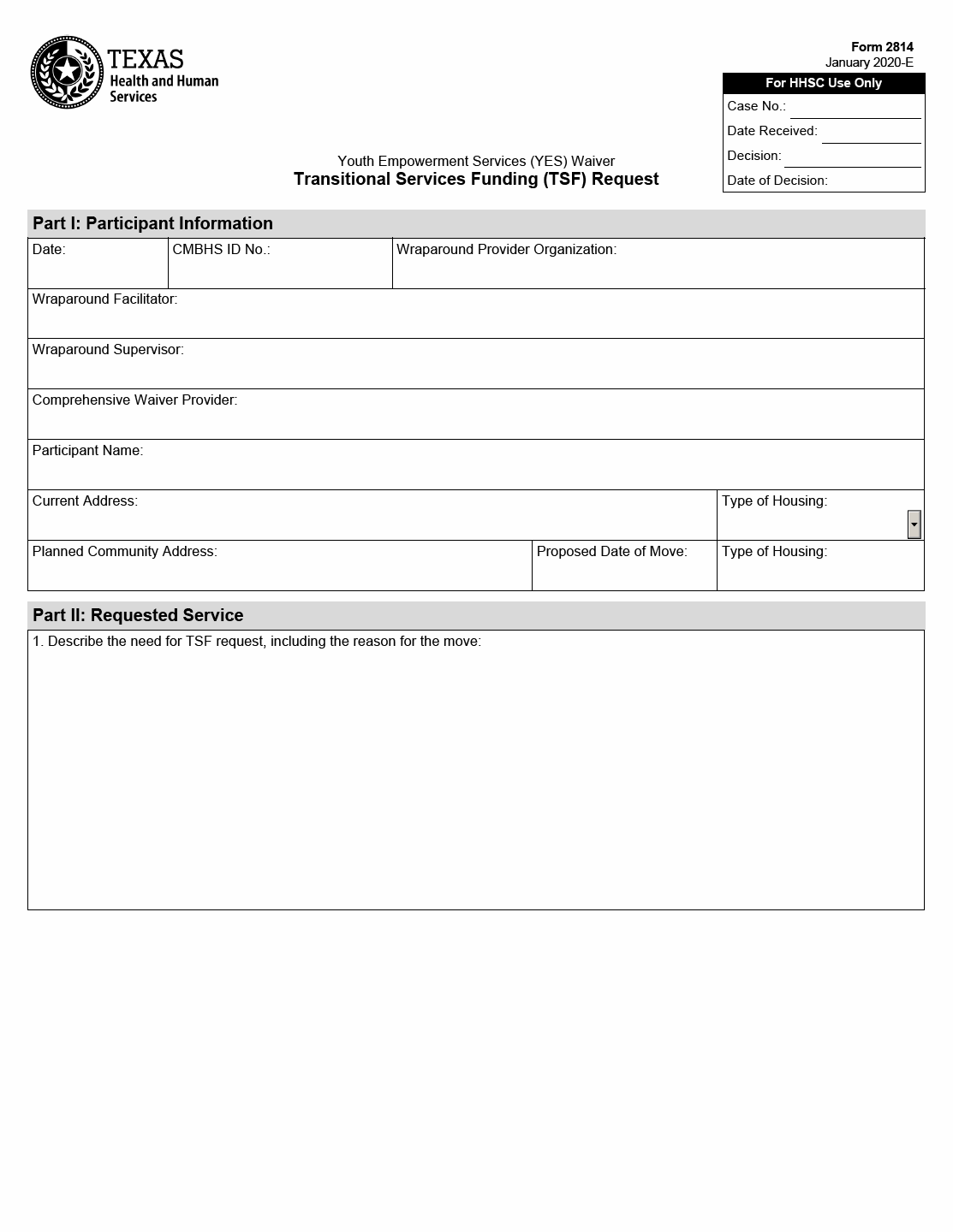 TX HHS Form 2814. Youth Empowerment Services (YES) Waiver Transitional Services Funding (TSF) Request