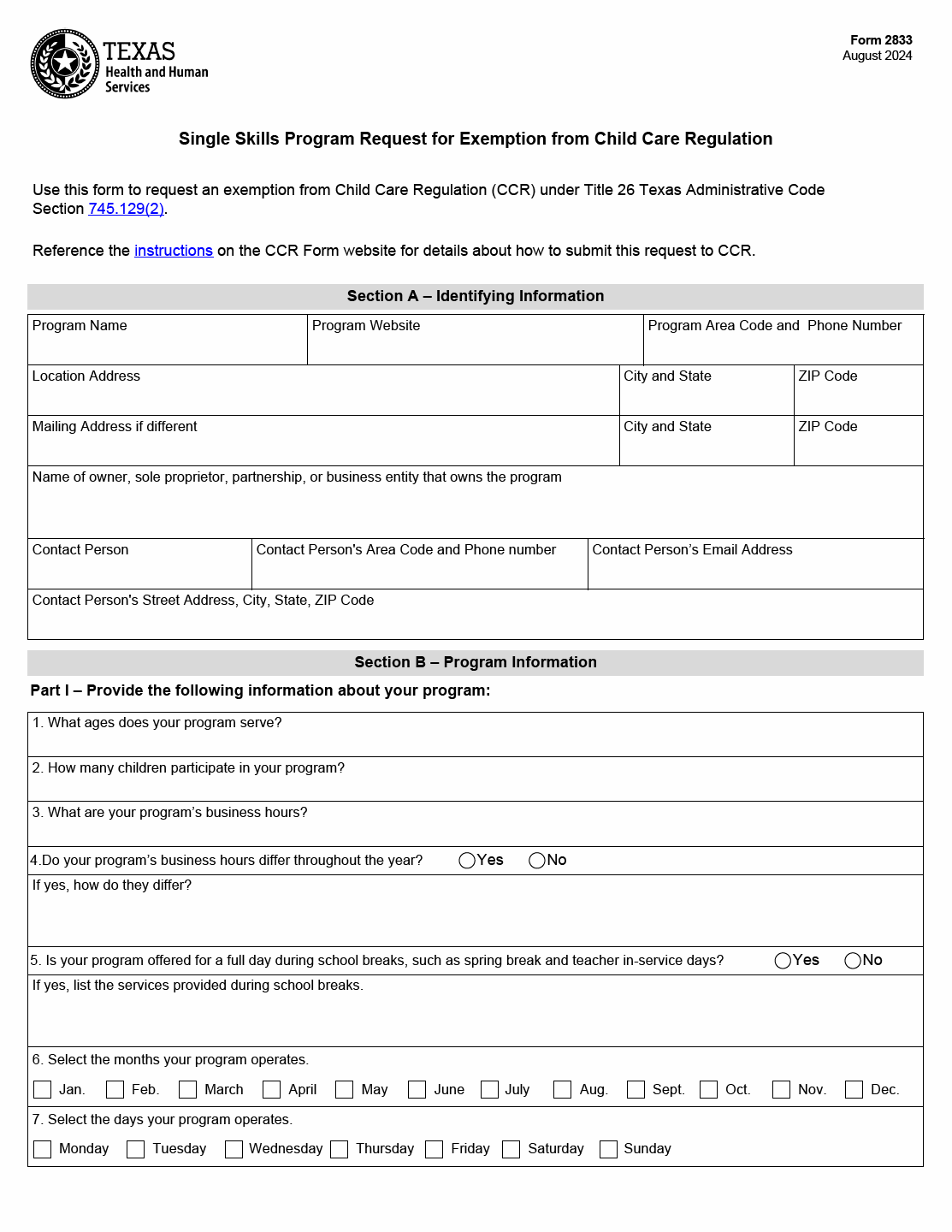 TX HHS Form 2833. Single Skill Program Request for Exemption from Child Care Regulation