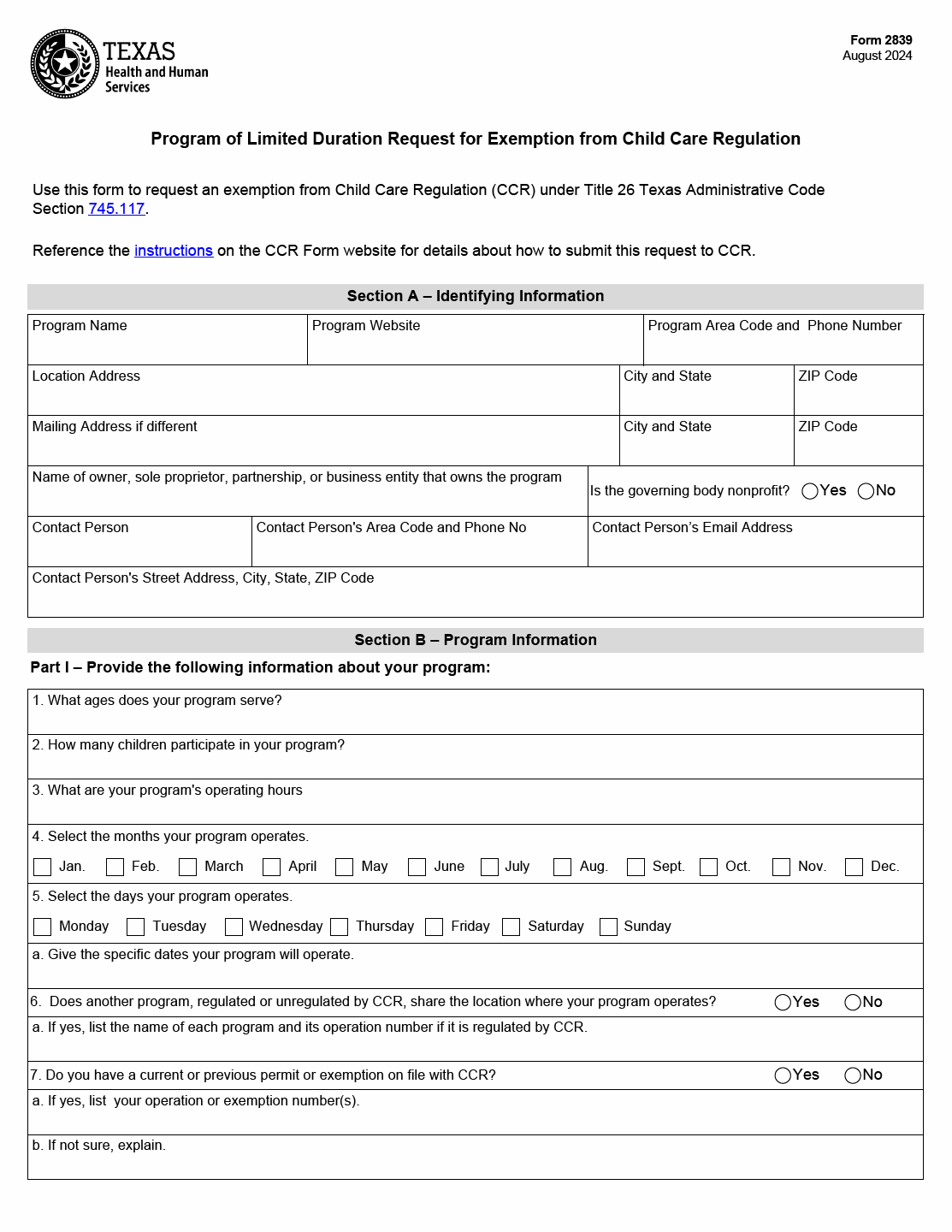 TX HHS Form 2839. Program of Limited Duration Request for Exemption from Child Care Regulation
